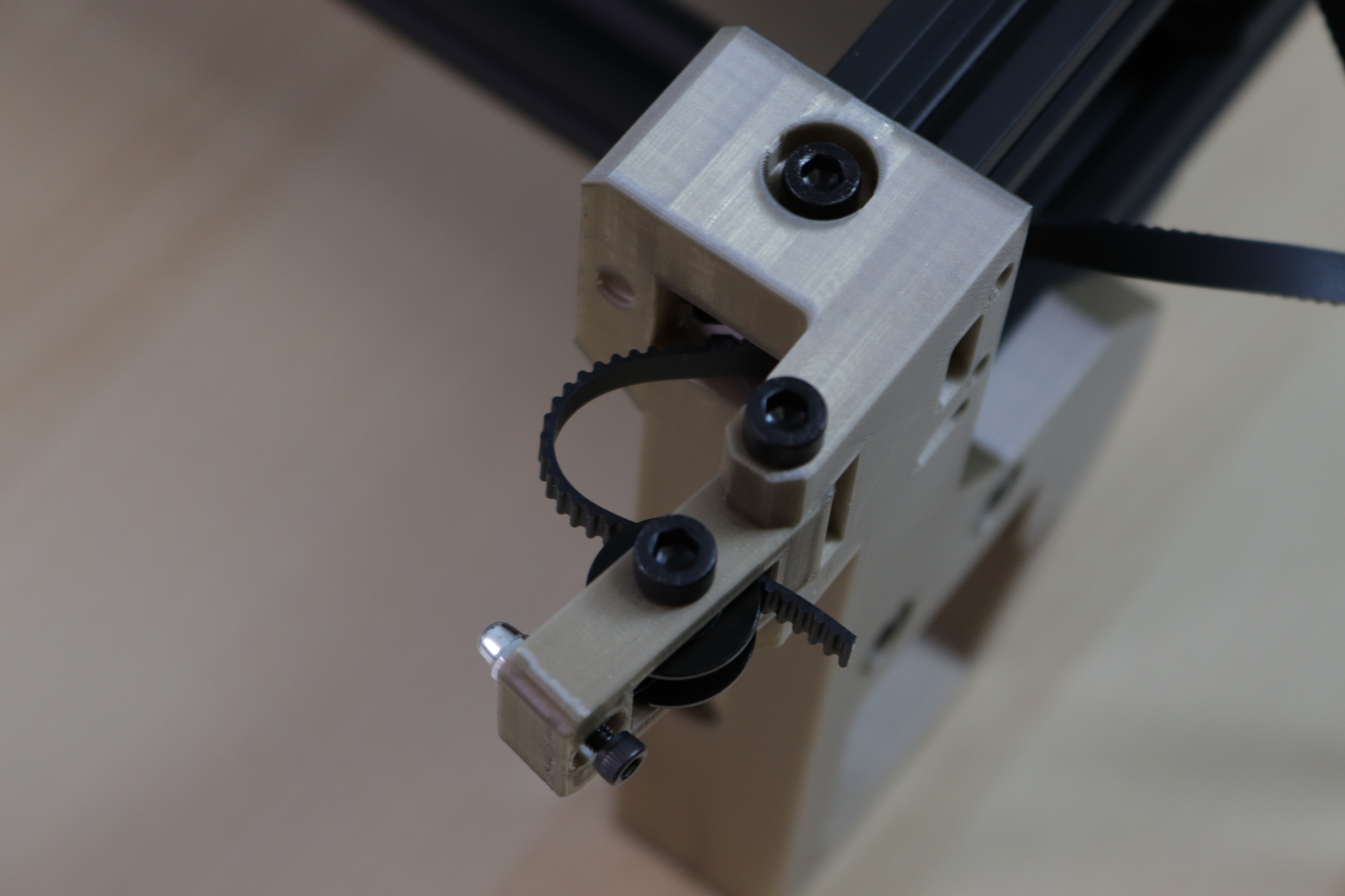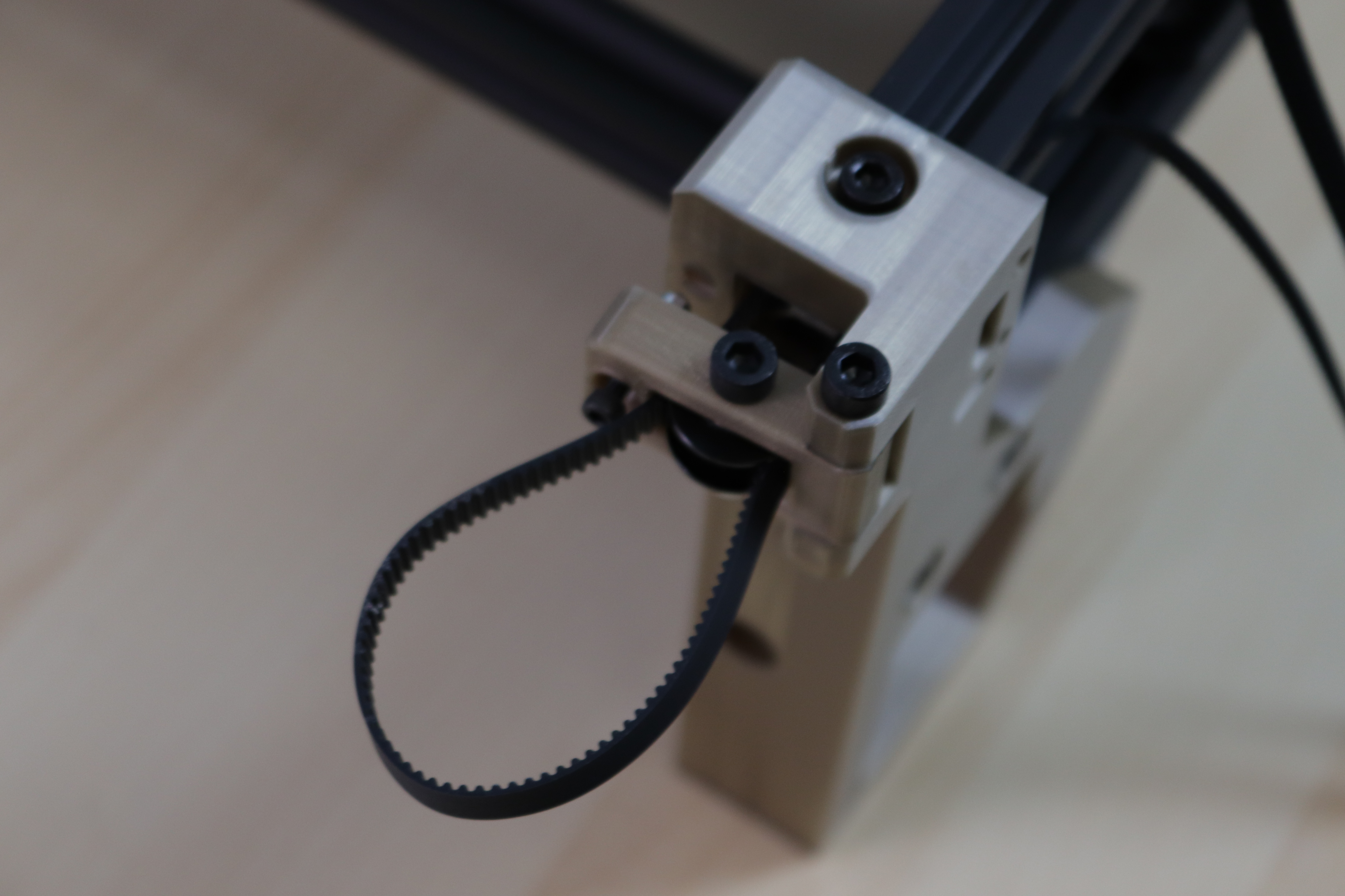 Belt Clamps. Make sure the belt tensioner on the front leg is completely unscrewed, meaning it's angled as close to the leg as it can be. This will give us the most possible stroke to tension the belt in the next step. -