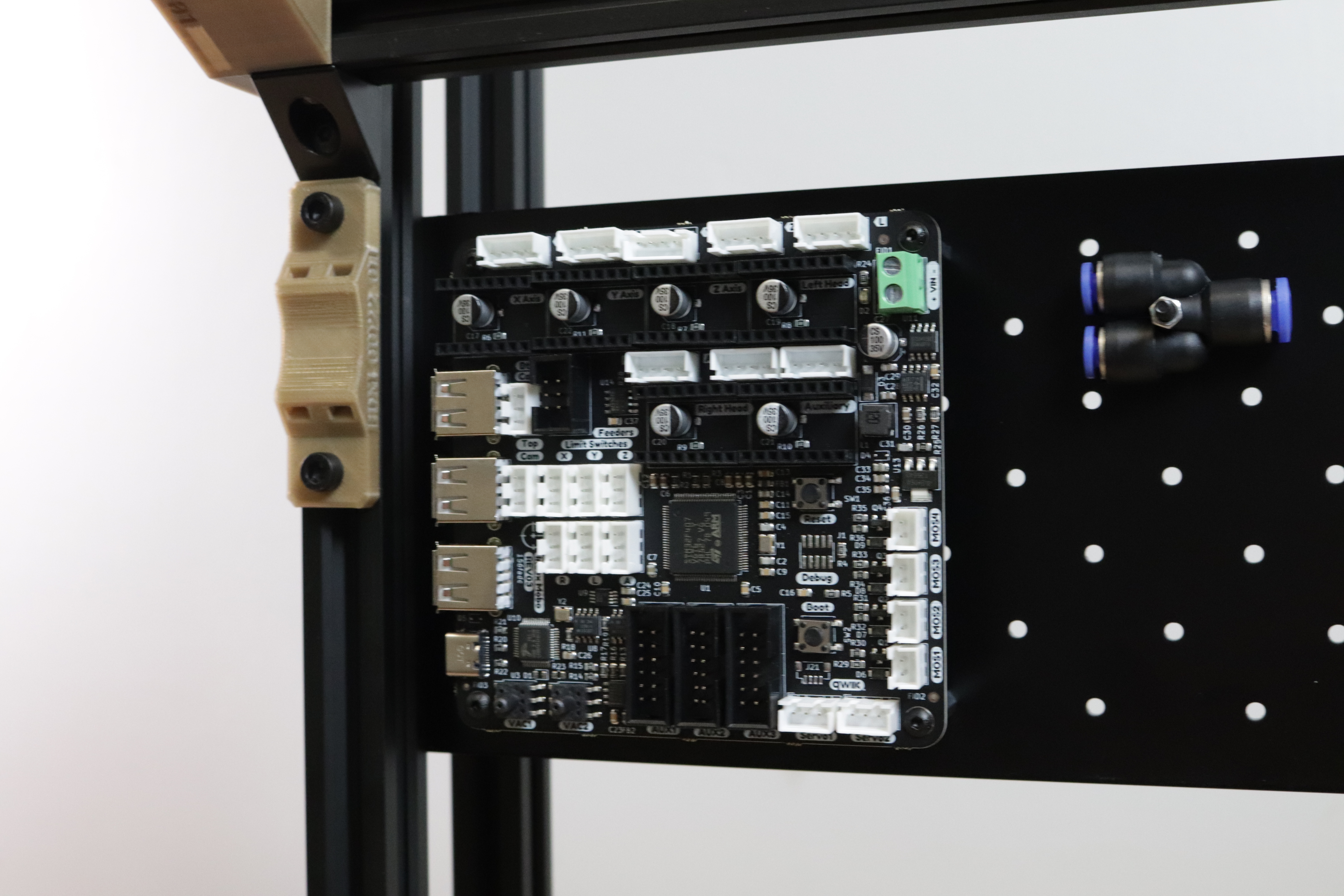 Now we can mount the motherboard itself. Confirm the orientation of your motherboard so that the USB ports are facing to the left and the vacuum sensors on the bottom. Then use four M3x10mm screws to secure the motherboard to the standoffs.