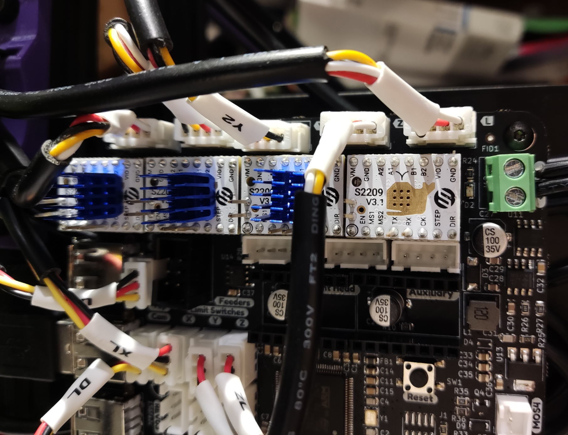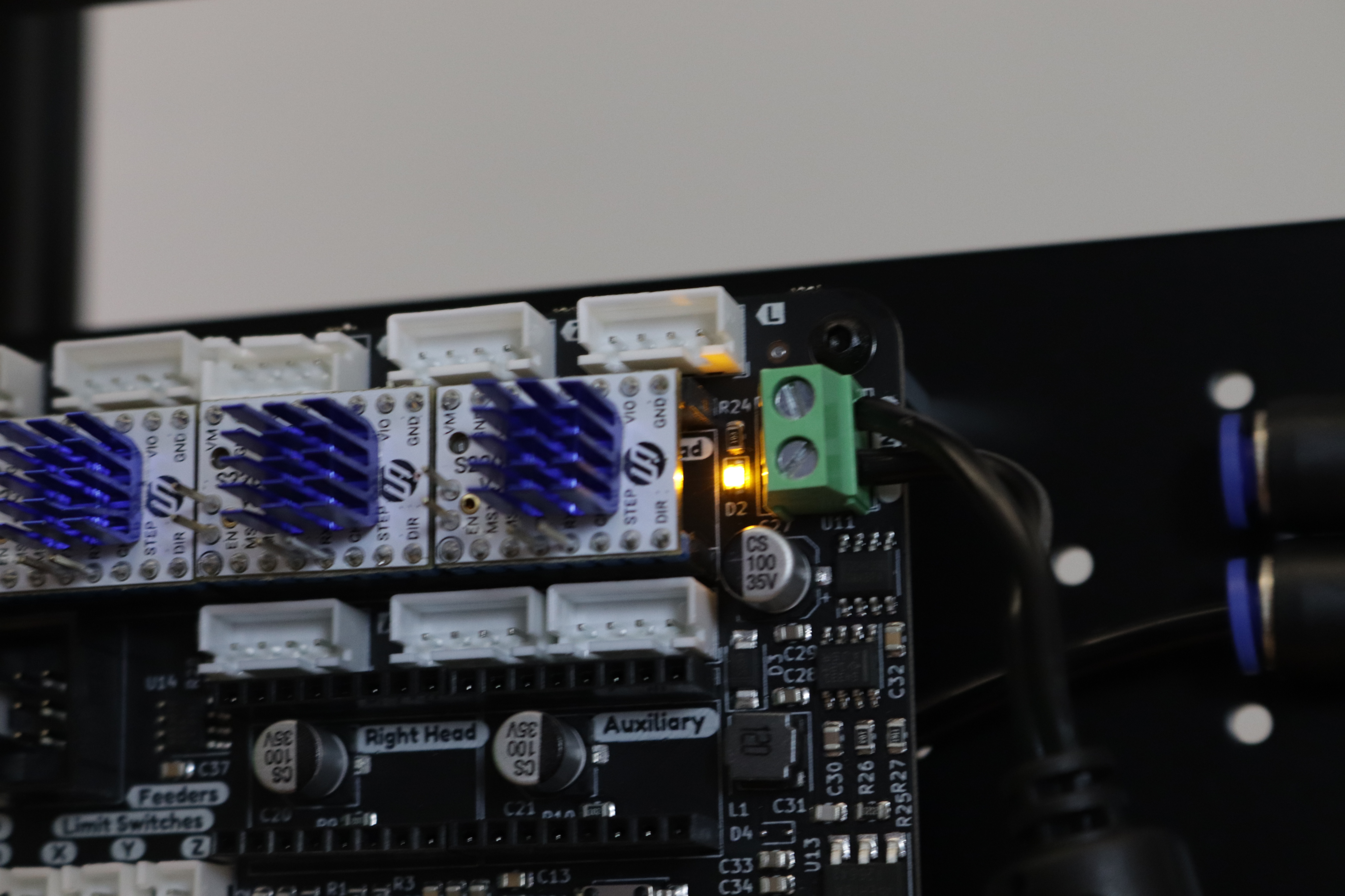 Install the four stepper motor drivers into the X, Y, Z, and Left Head slots. Note that the whale icon on the motor drivers will be right-side up and the two upward-facing pins will be facing to the left.
