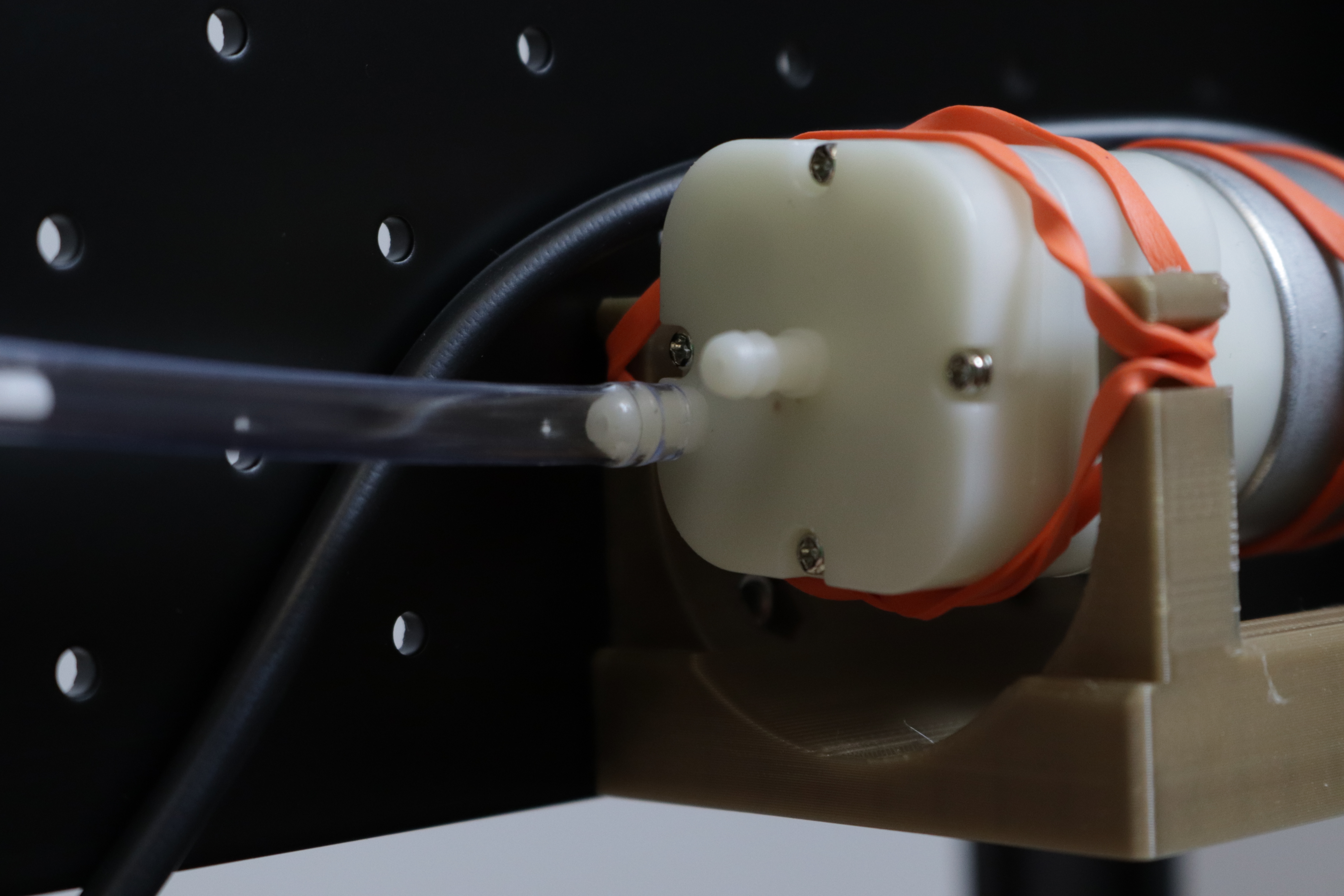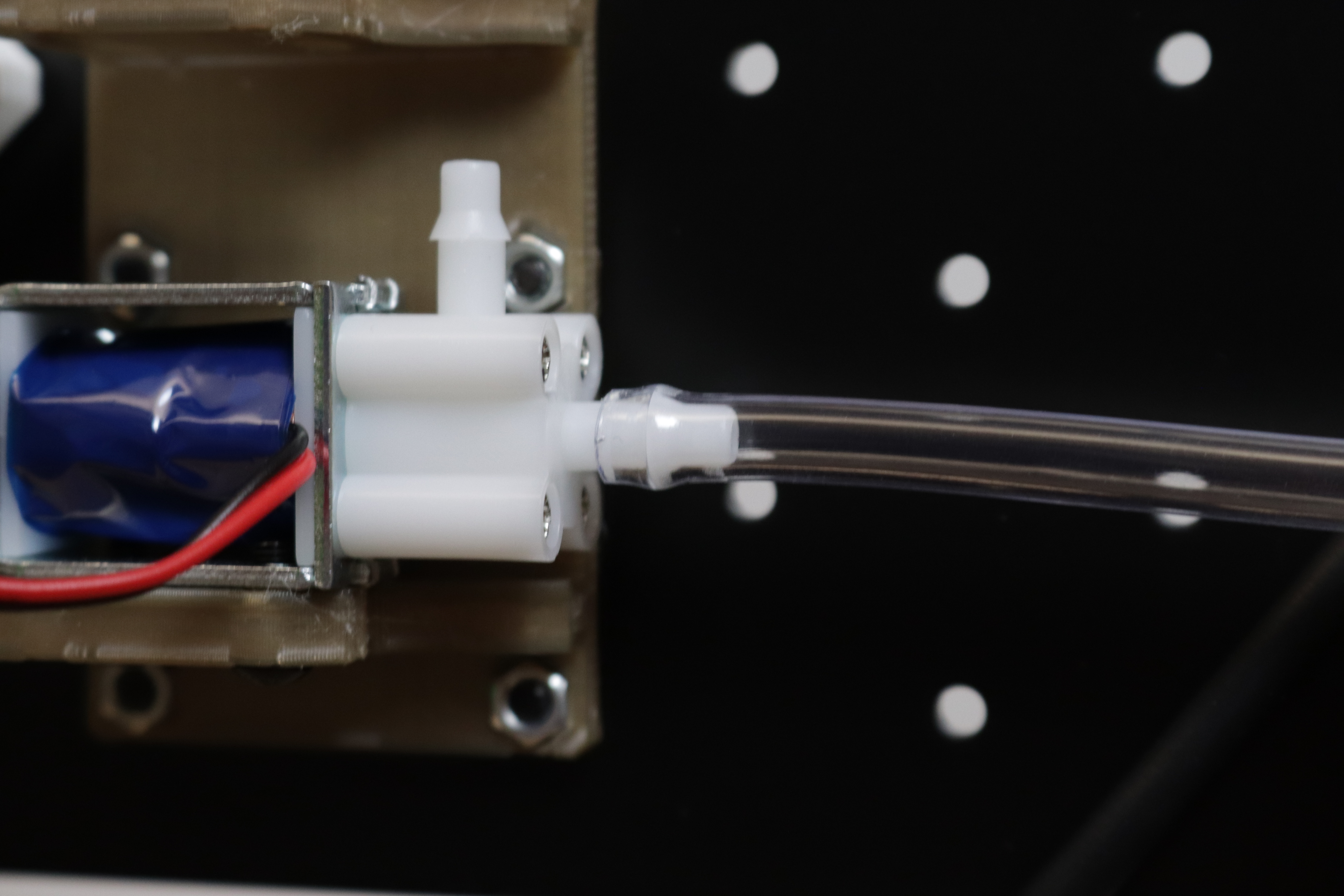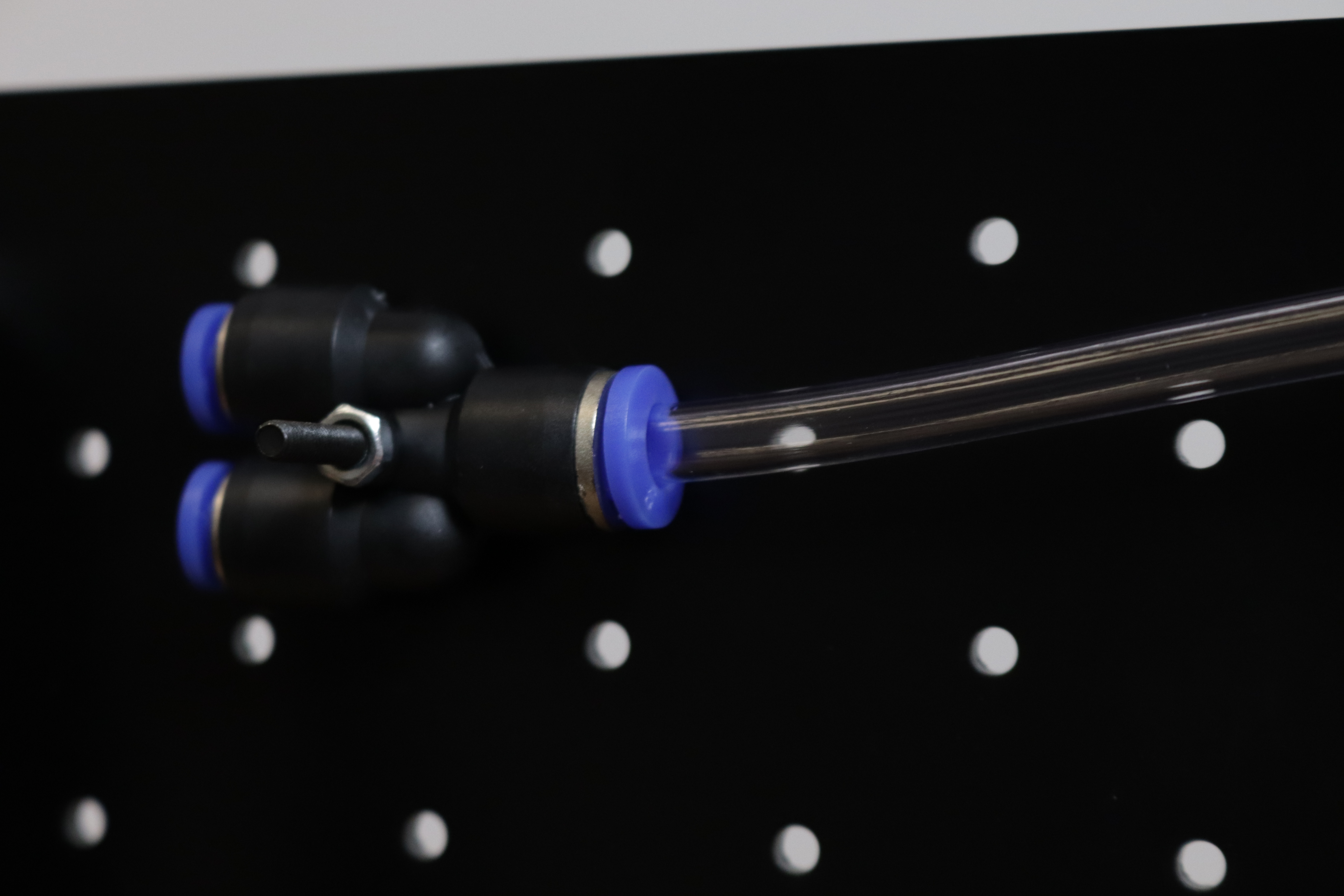 - The origin of vacuum in the machine is our vacuum pump. The off-center port is the one that provides vacuum. Start by cutting a 65mm section of the 6mm clear tubing and pushing it onto the off-center port on the vacuum pump. Push the other end onto the inline plastic port of the valve as shown below.