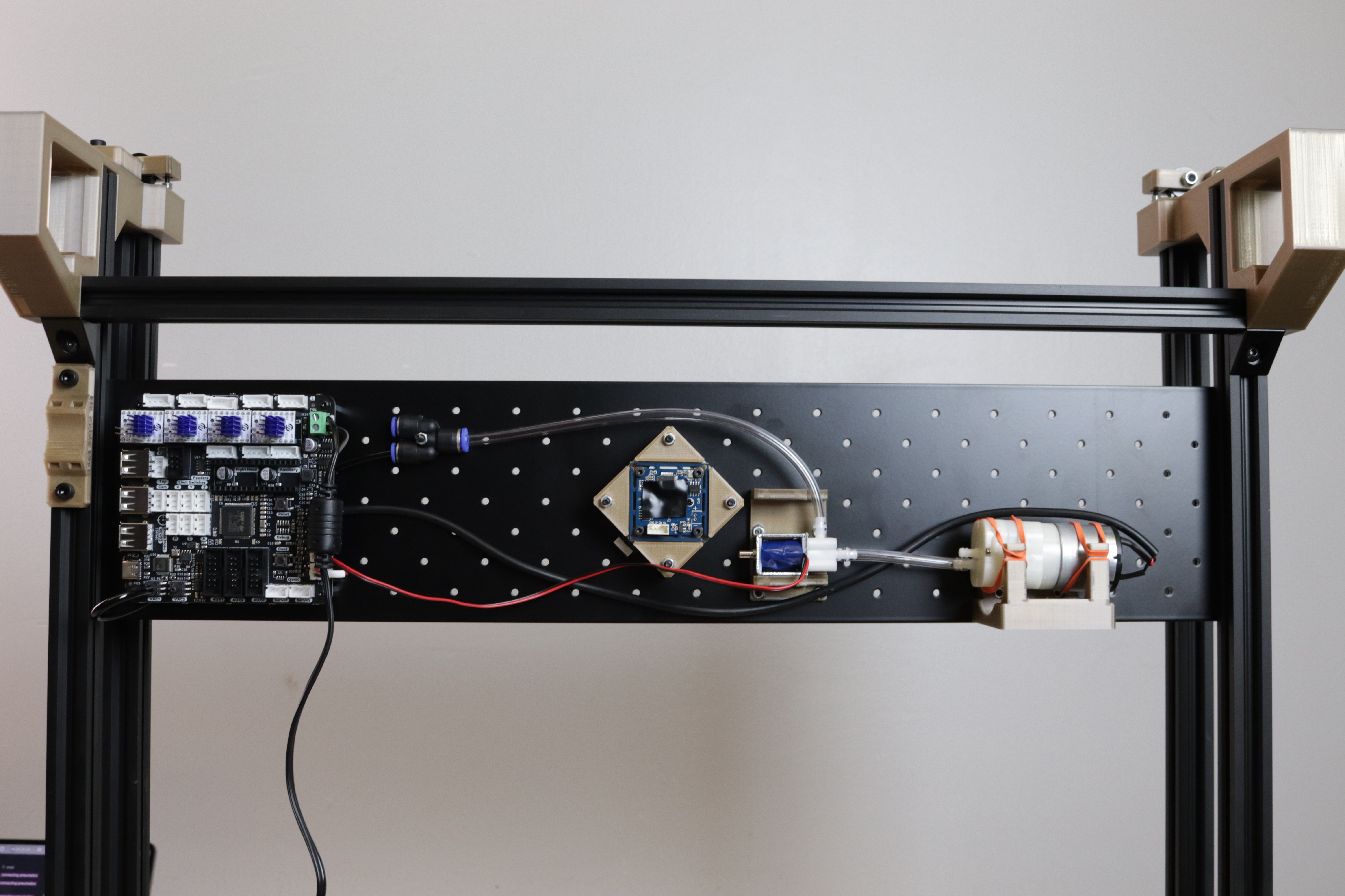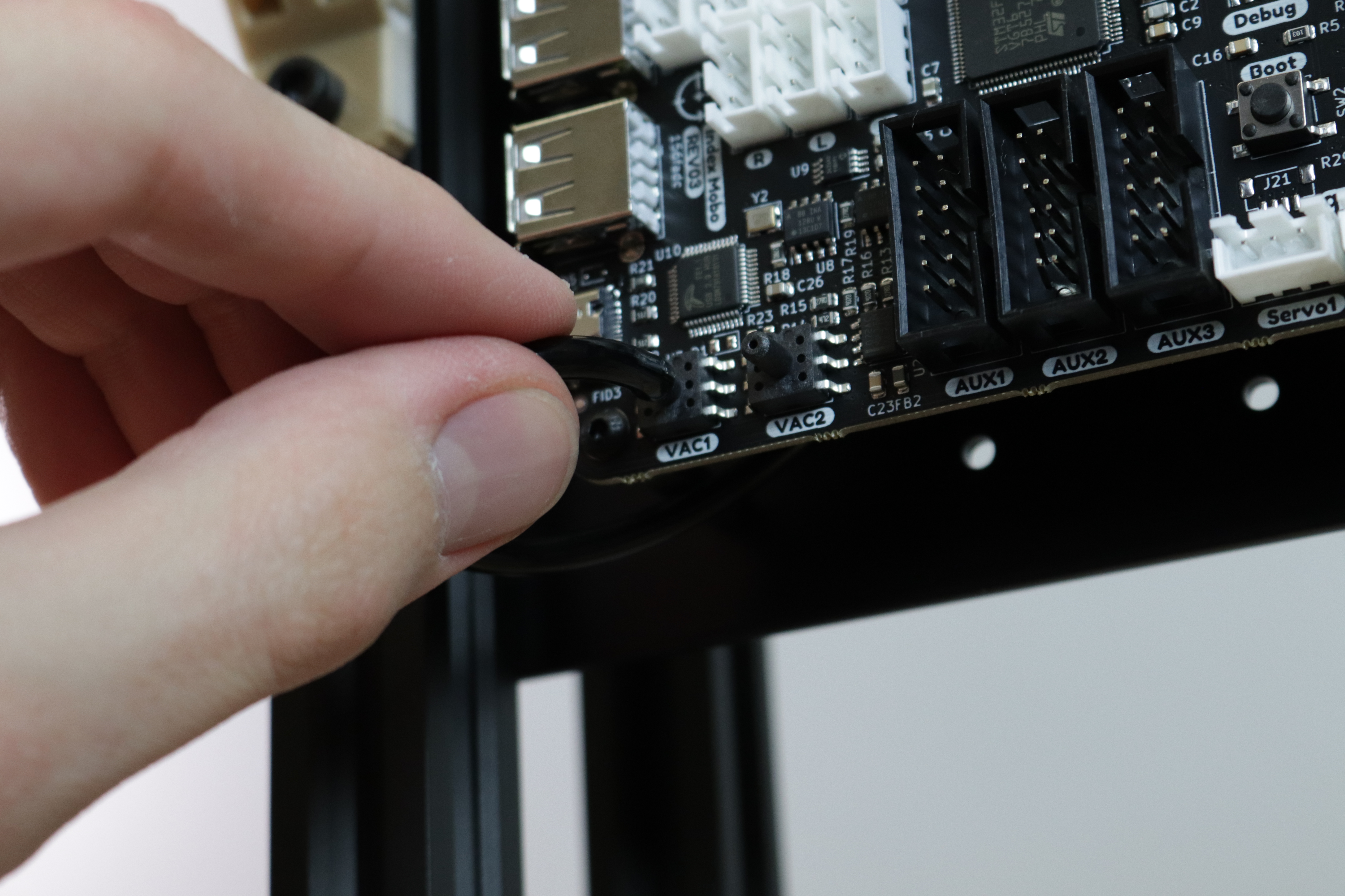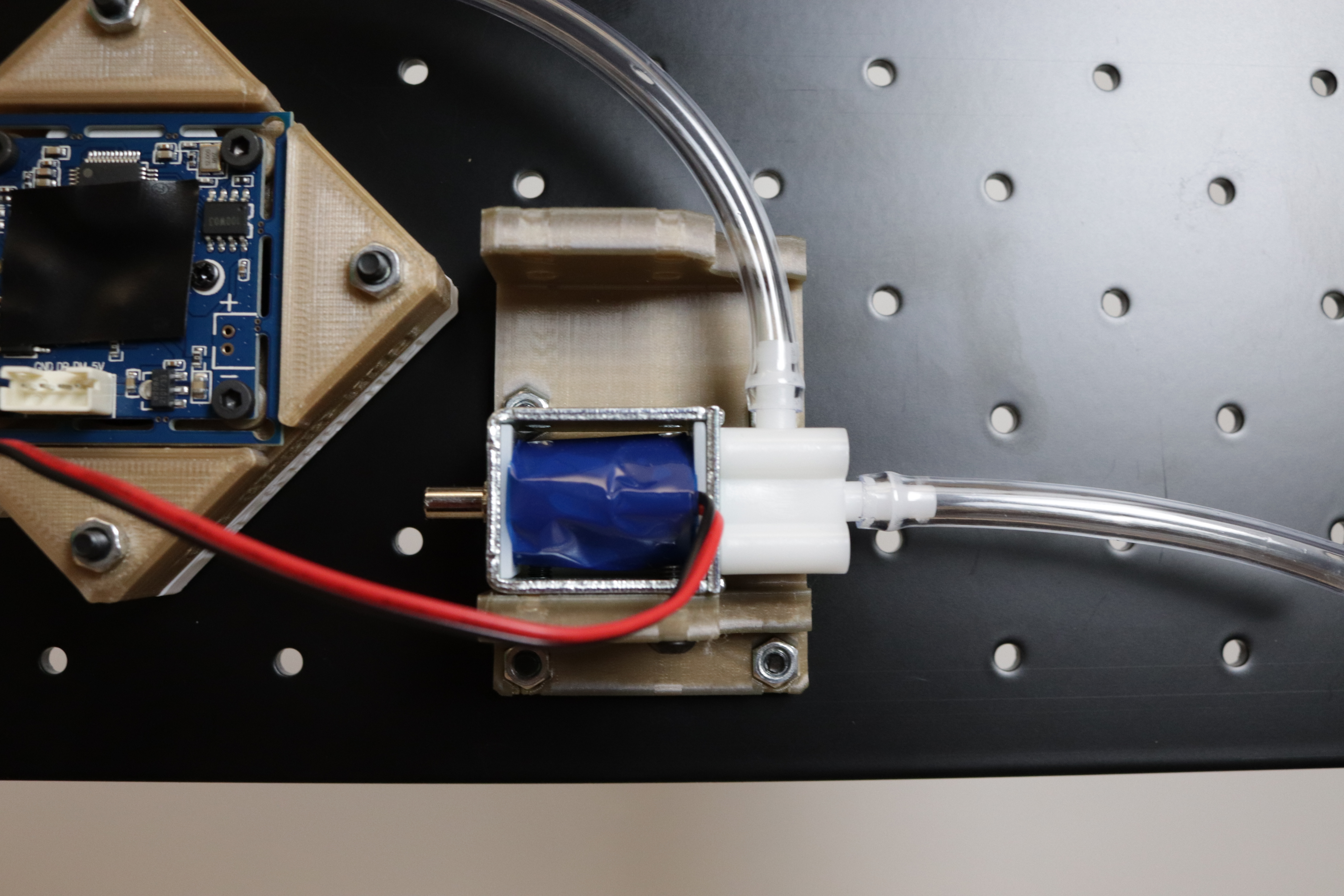 - The origin of vacuum in the machine is our vacuum pump. The off-center port is the one that provides vacuum. Start by cutting a 65mm section of the 6mm clear tubing and pushing it onto the off-center port on the vacuum pump. Push the other end onto the inline plastic port of the valve as shown below.