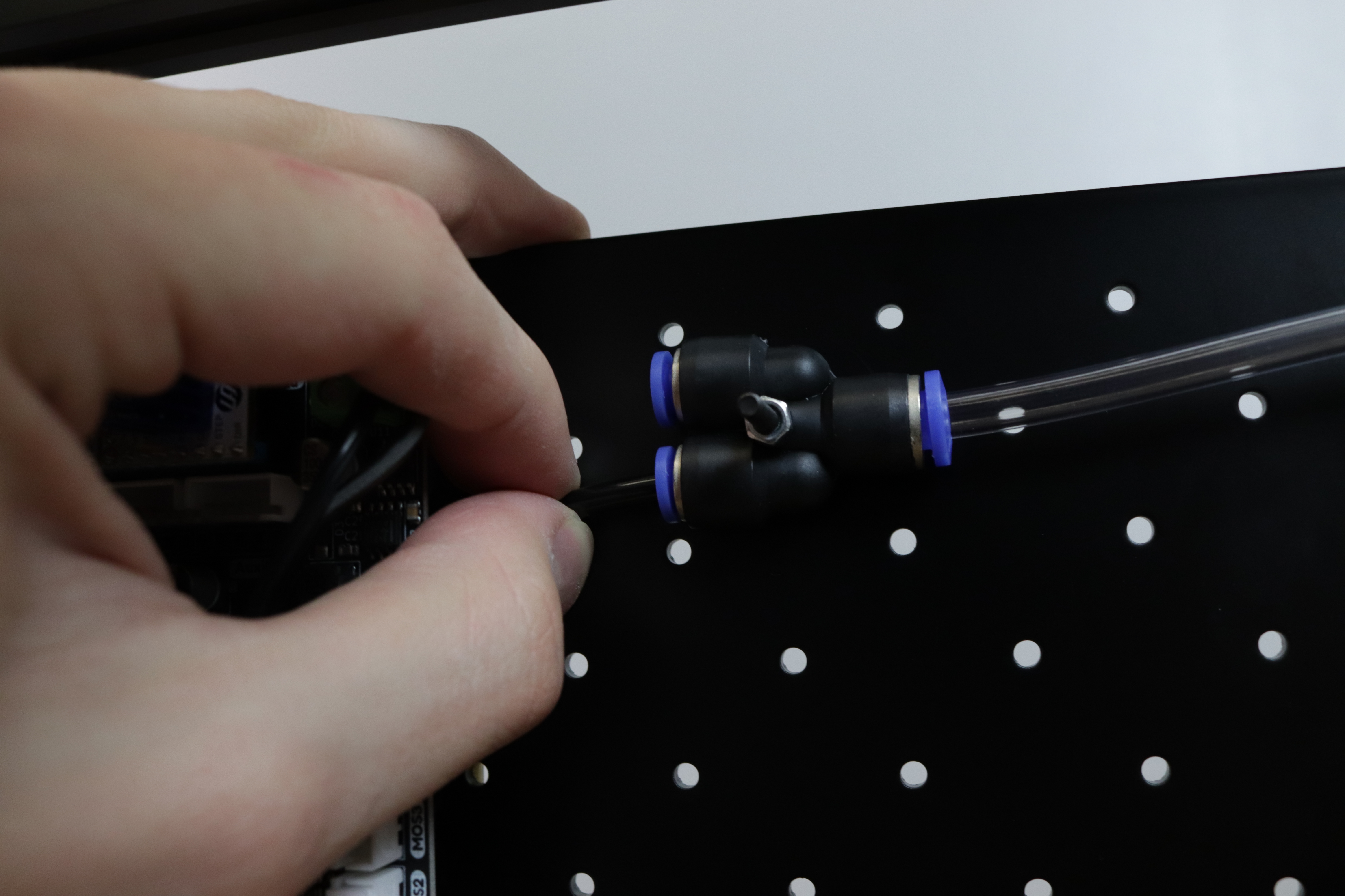 Switch to using the smaller, 4mm black tubing. Cut a 235mm length of 4mm OD tubing and push one side into a fork of the Y splitter, and route the other end underneath the motherboard and onto the