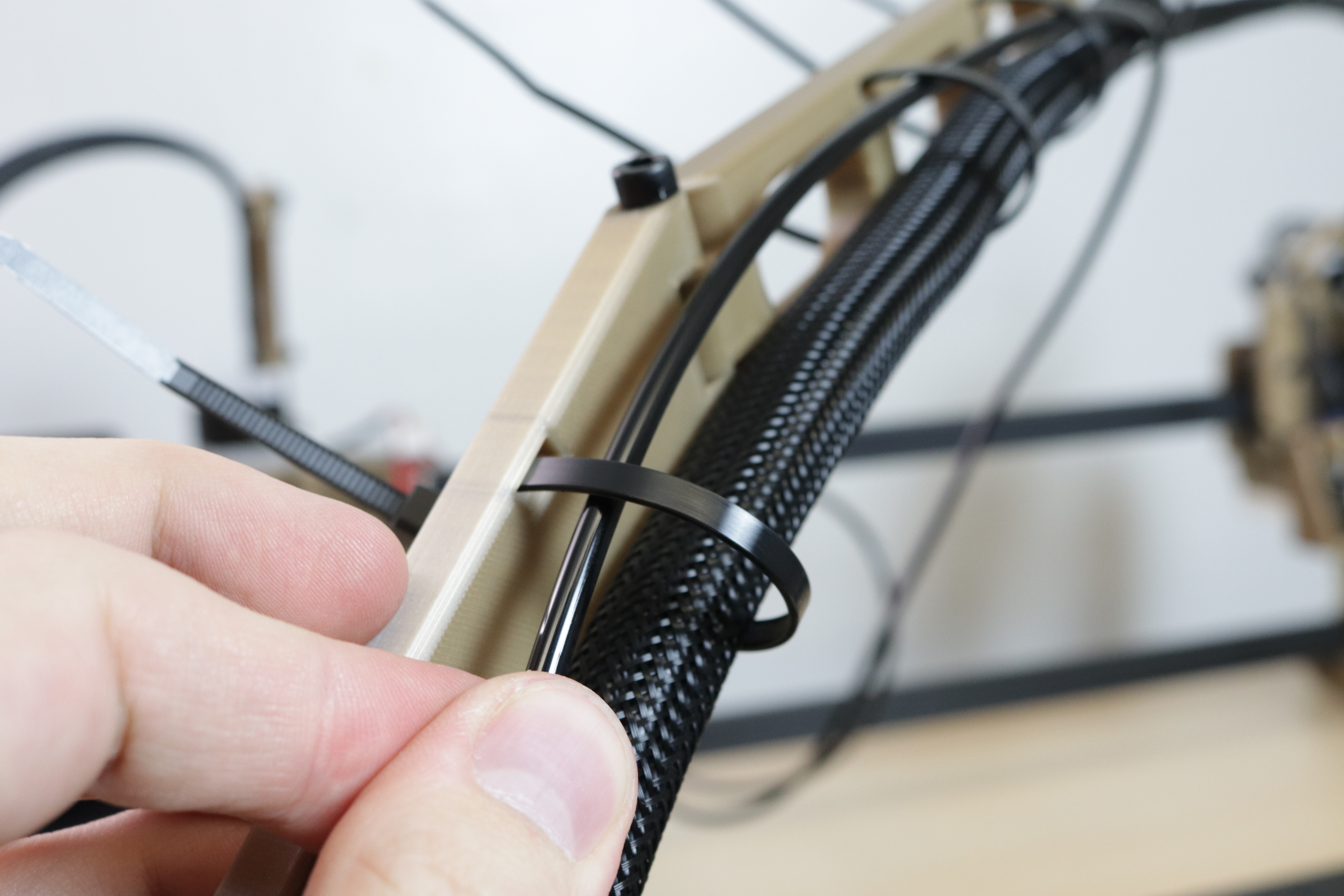 Now that the pneumatics are also routed, we can finally tighten the zip ties on the umbilical cable guide. While your machine is still back on its haunches, tighten the zip tie on the umbilical guide to secure the wires and tubing to the frame.
