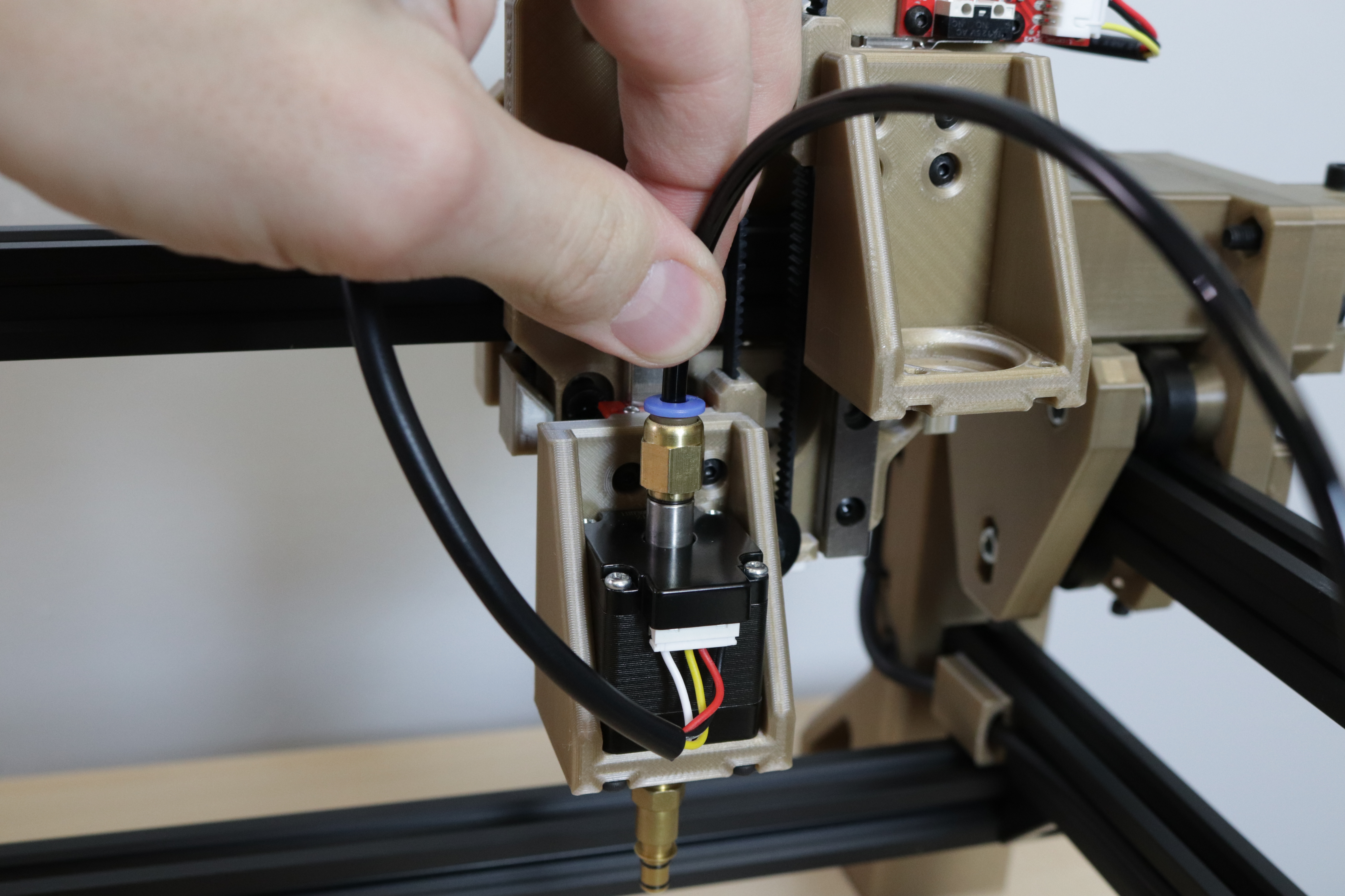With the pneumatic tubing dangling loose past the end of the swivel arm, cut any excess tubing (still allowing some slack for motor rotation) push the other end into the pneumatic coupling on the back side of the rotation stepper motor. Extra slack will allow the motor to rotate freely 180 degrees in each direction, so err on the side of leaving more than less. If the tubing falls away from the umbilical, use one or two small zip ties to secure them together.
