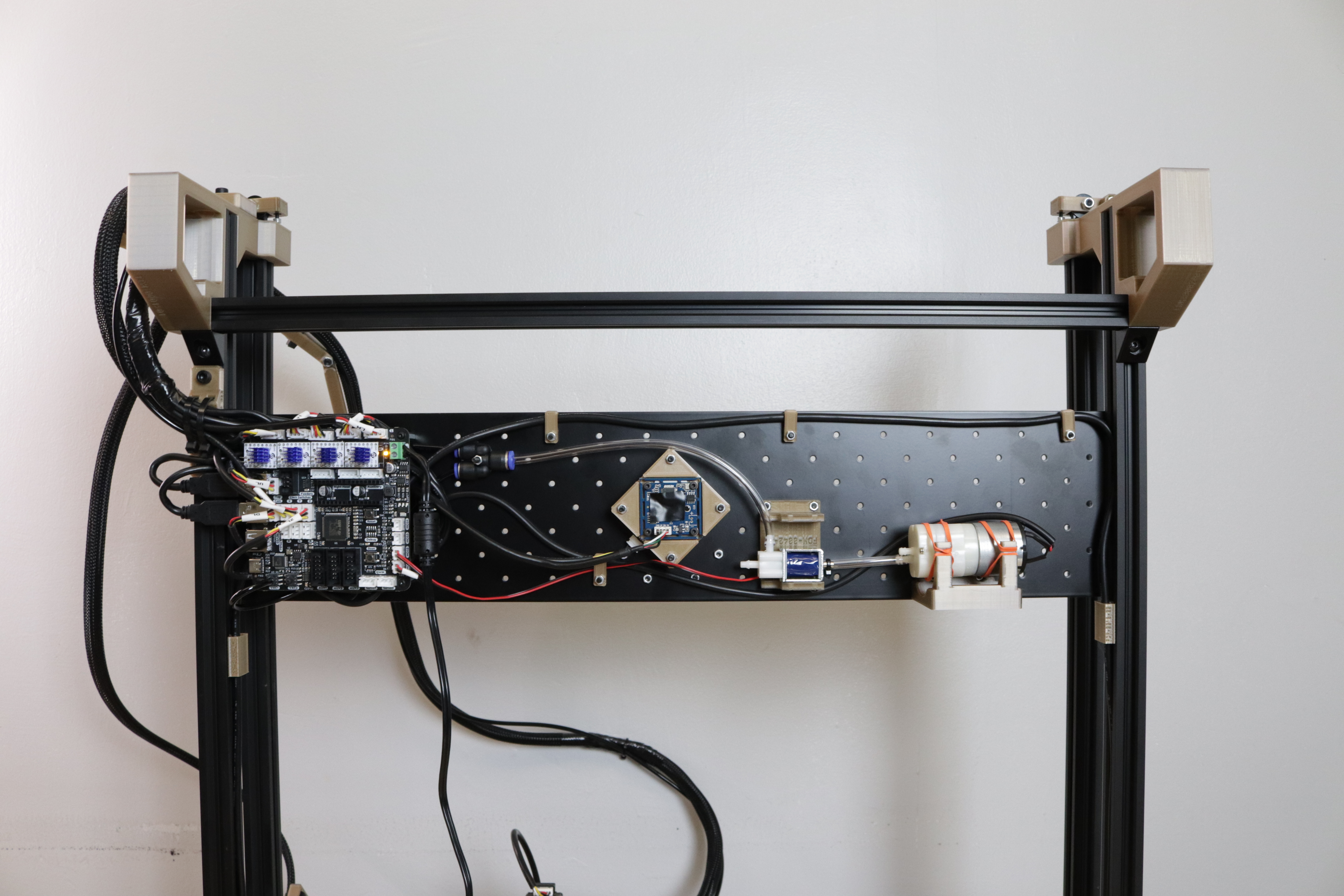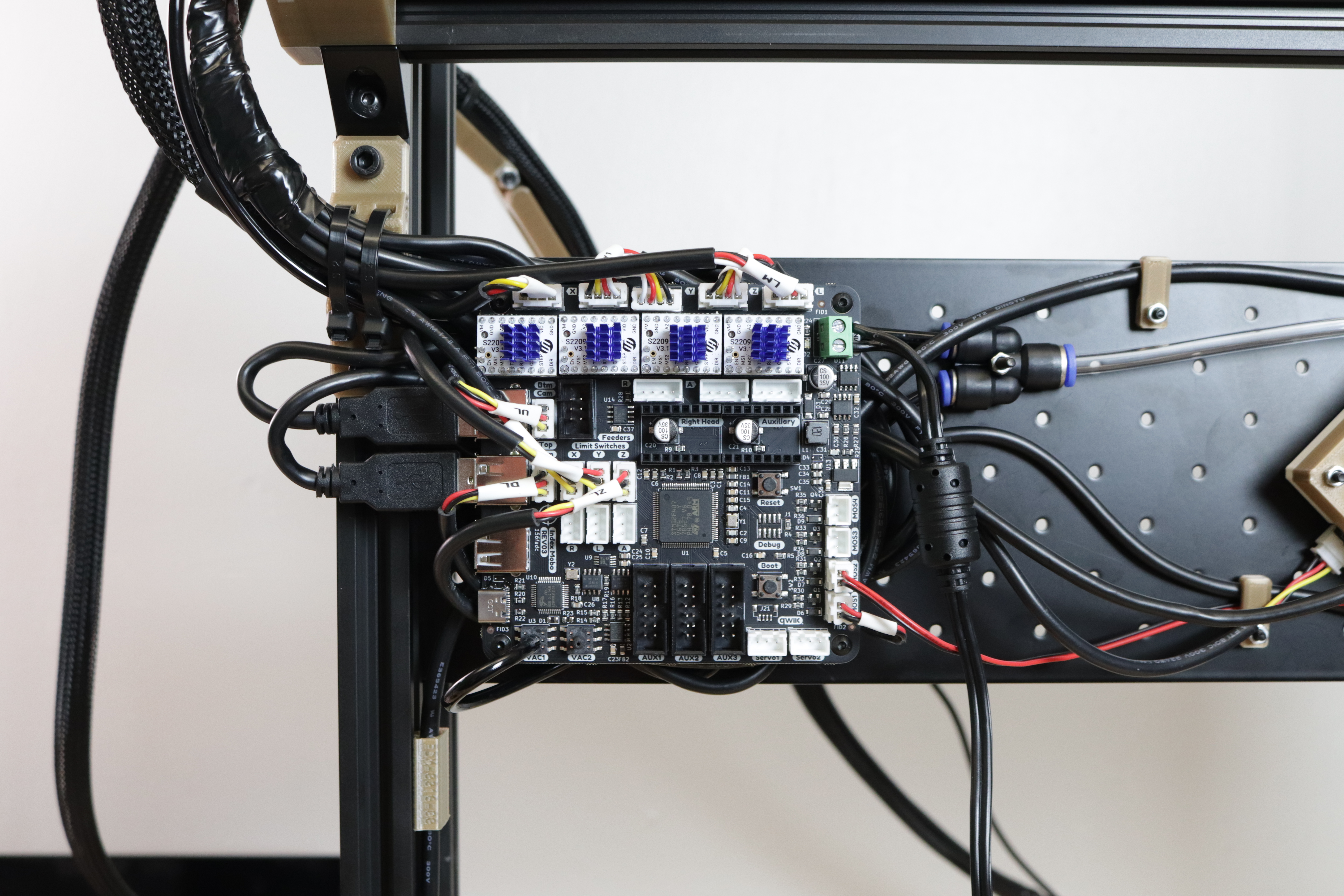 Take your LumenPnP and flip it up onto its haunches. You should see lots of cables loosely attached to the Frame Umbilical Mount, all looking for a home. We're about to give them one!