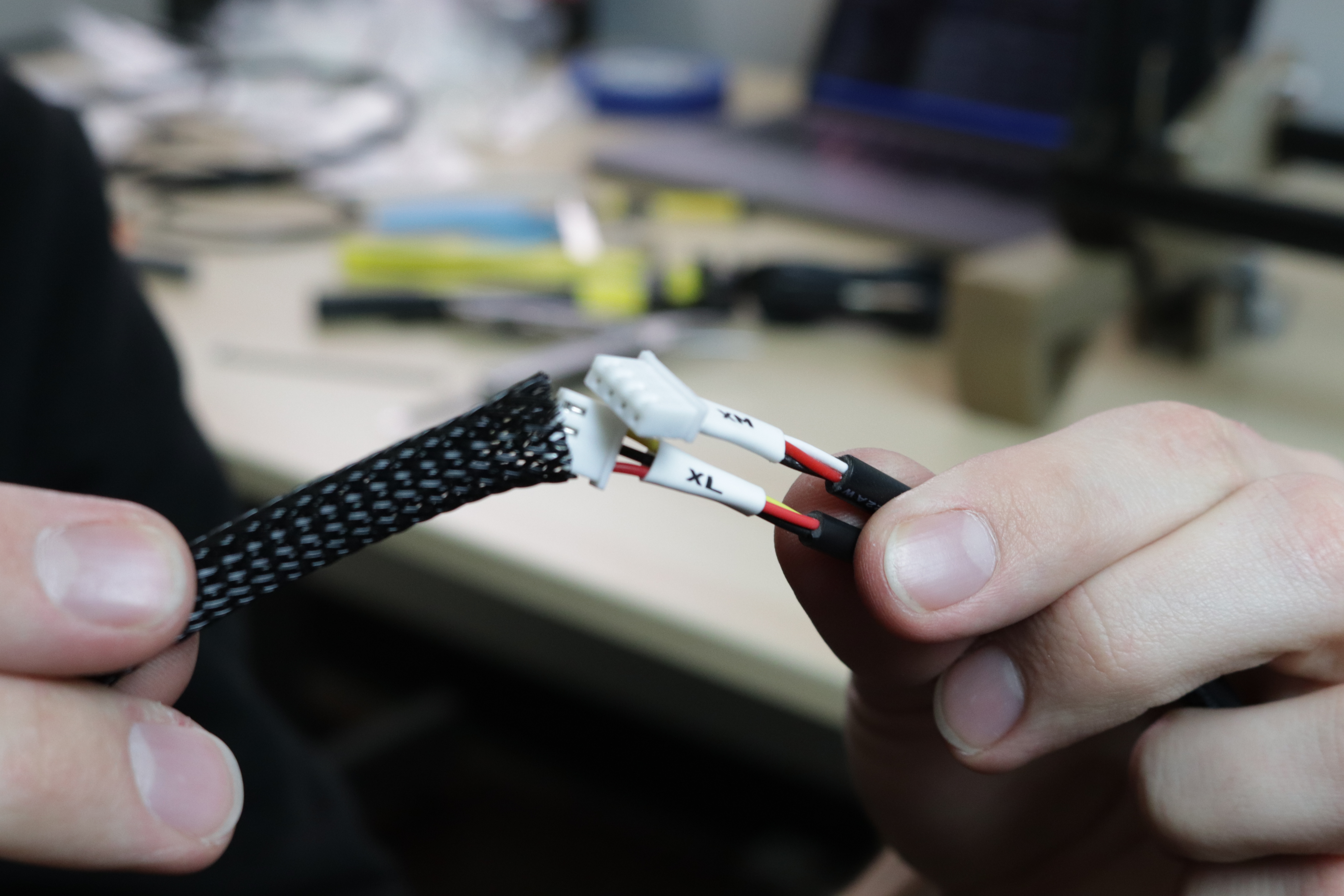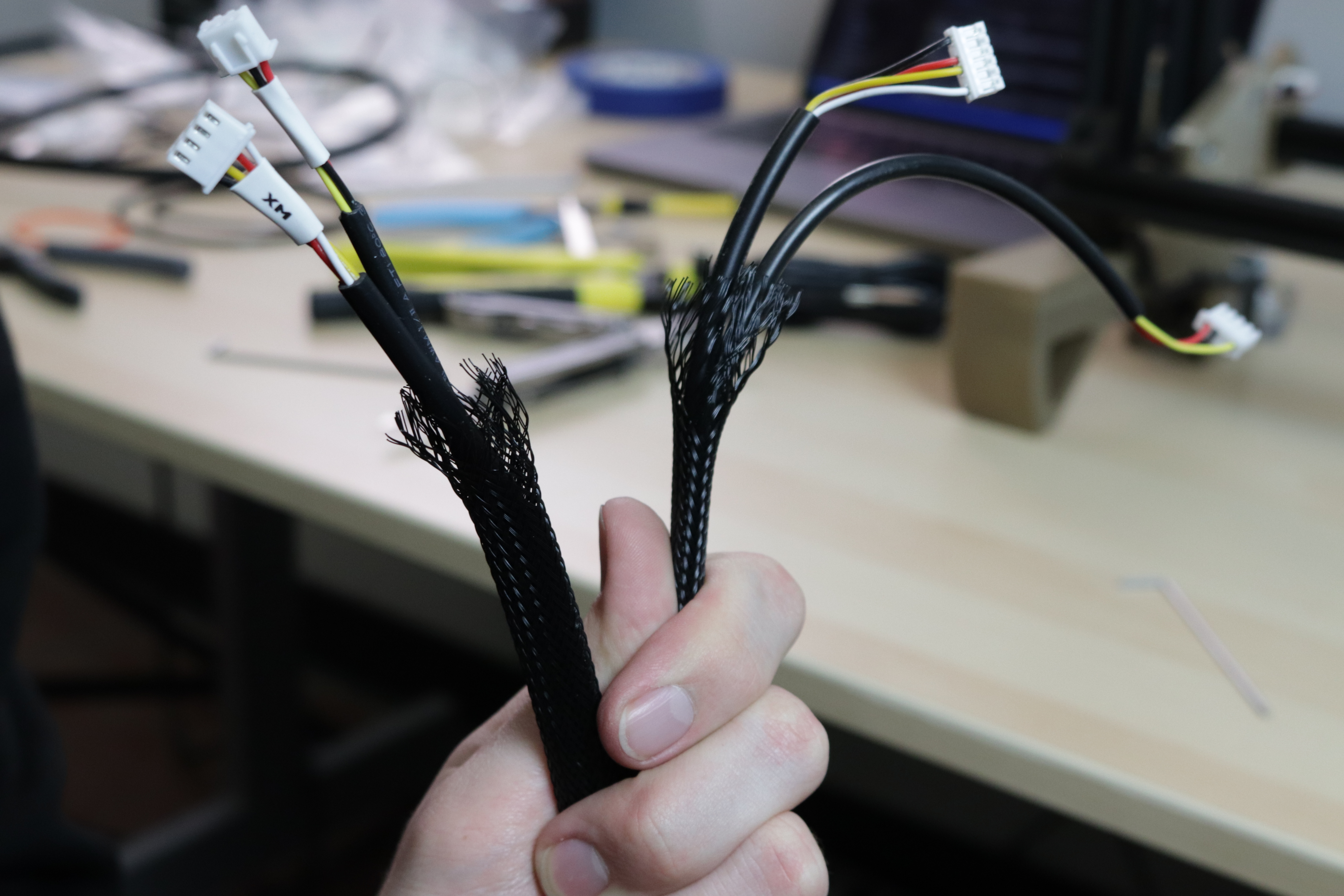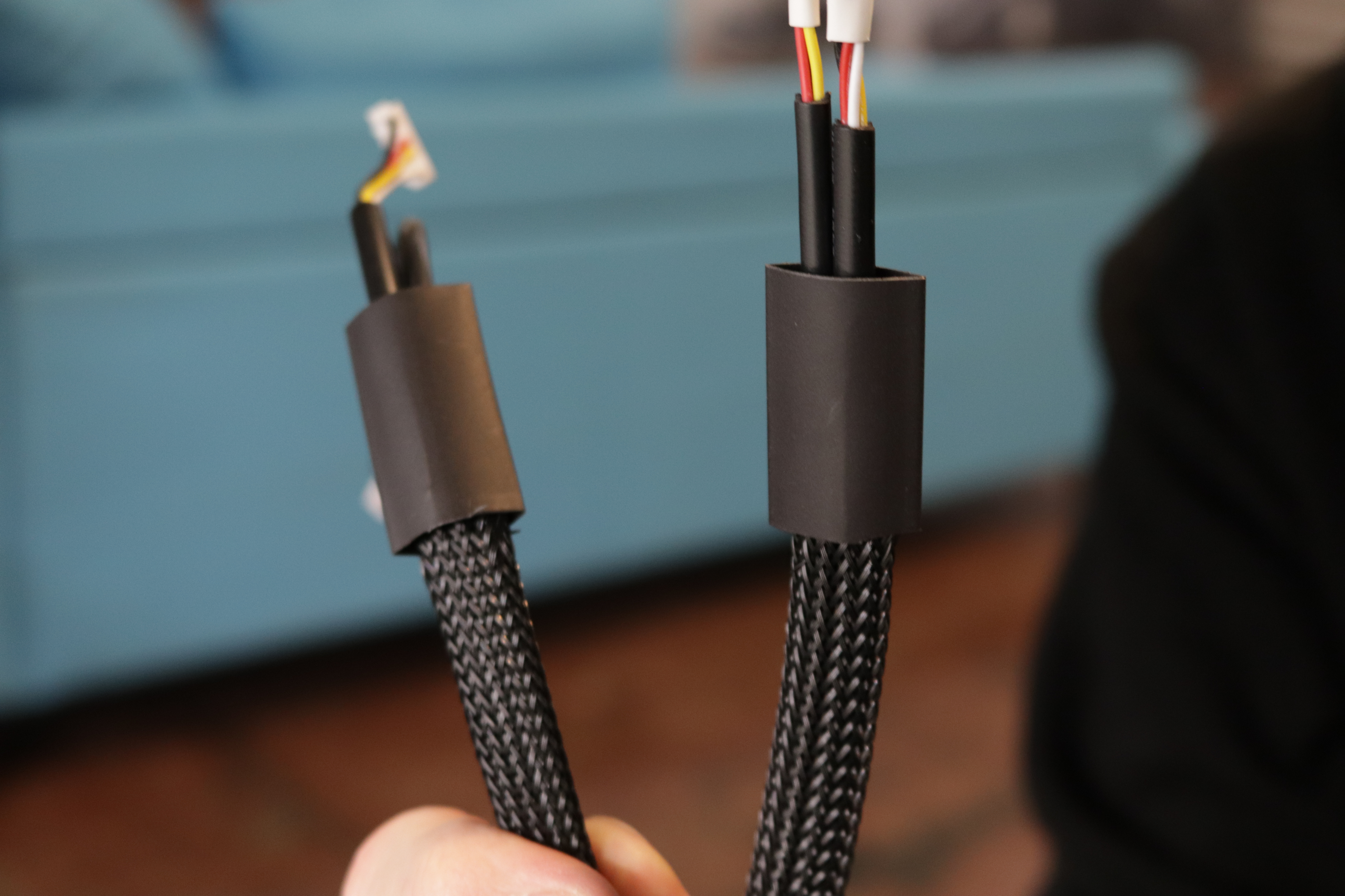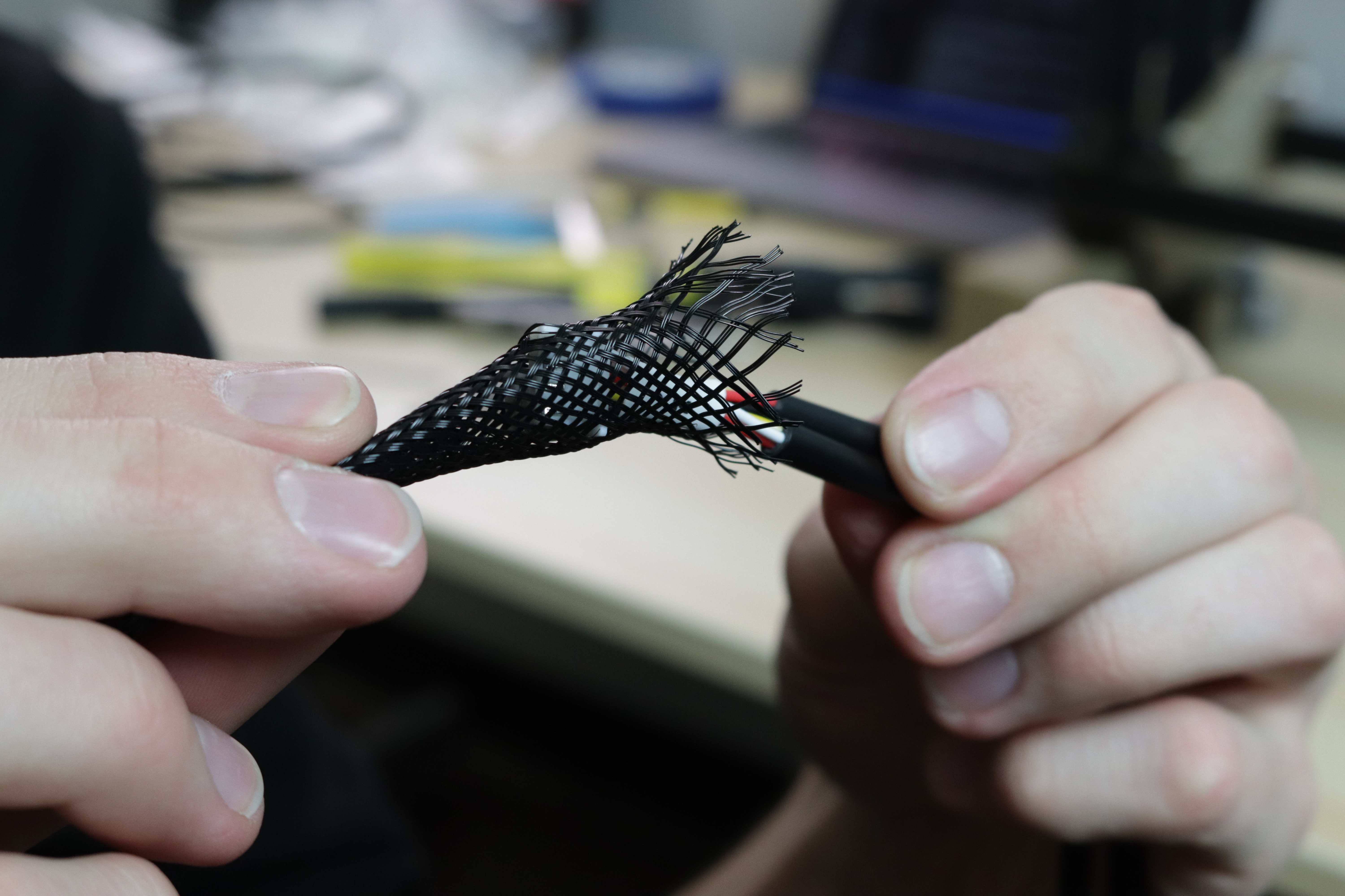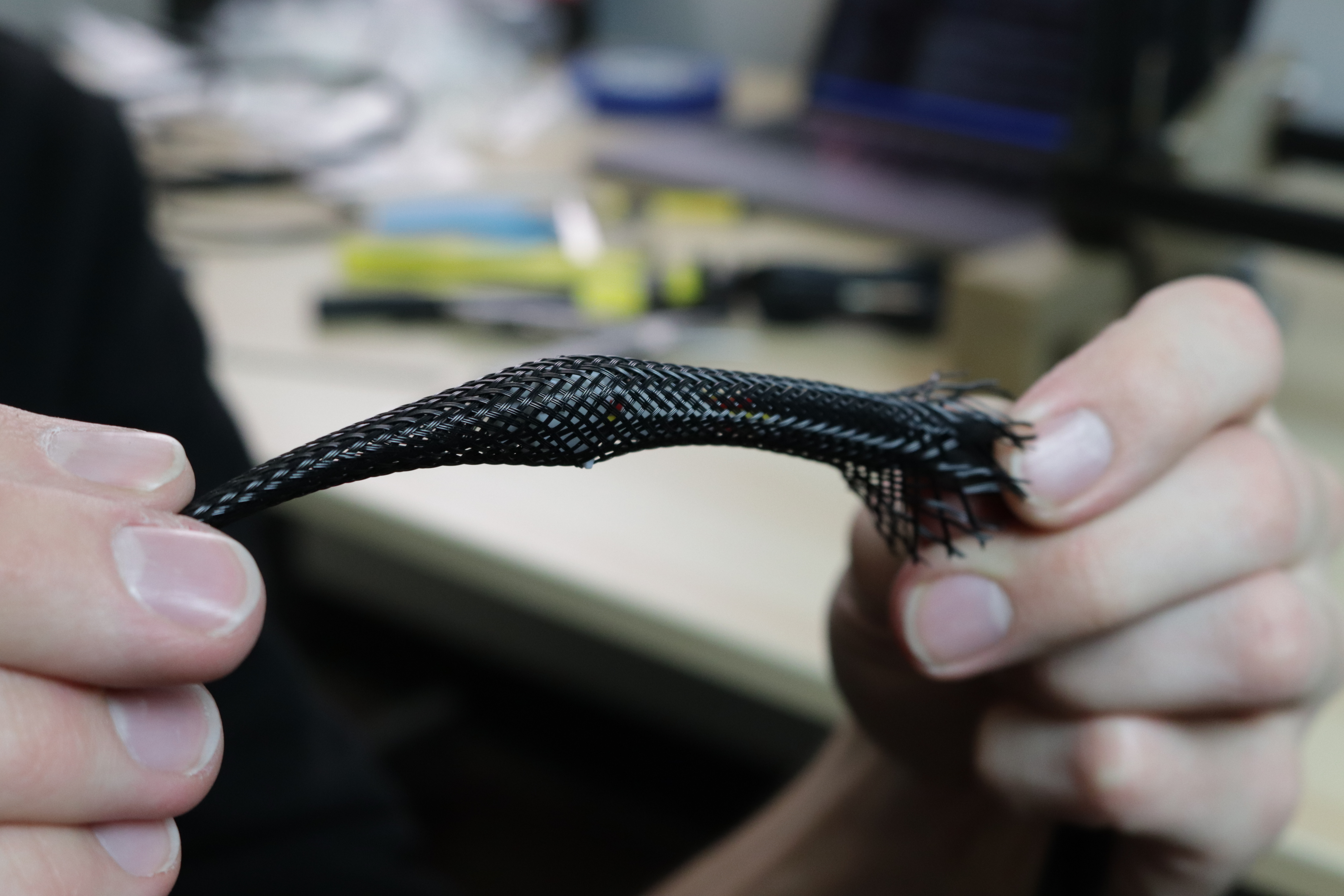 Now, cut a 1475mm piece of sheathing from the remainder and expand it by compressing it. You should find that inserting the cables at the correct offset will maintain this offset while pushing the sheathing over them. If it starts to fray a little bit, don't worry! This is purely a cosmetic step; you can trim off any frayed bits and use the heatshrink to clean up the ends.