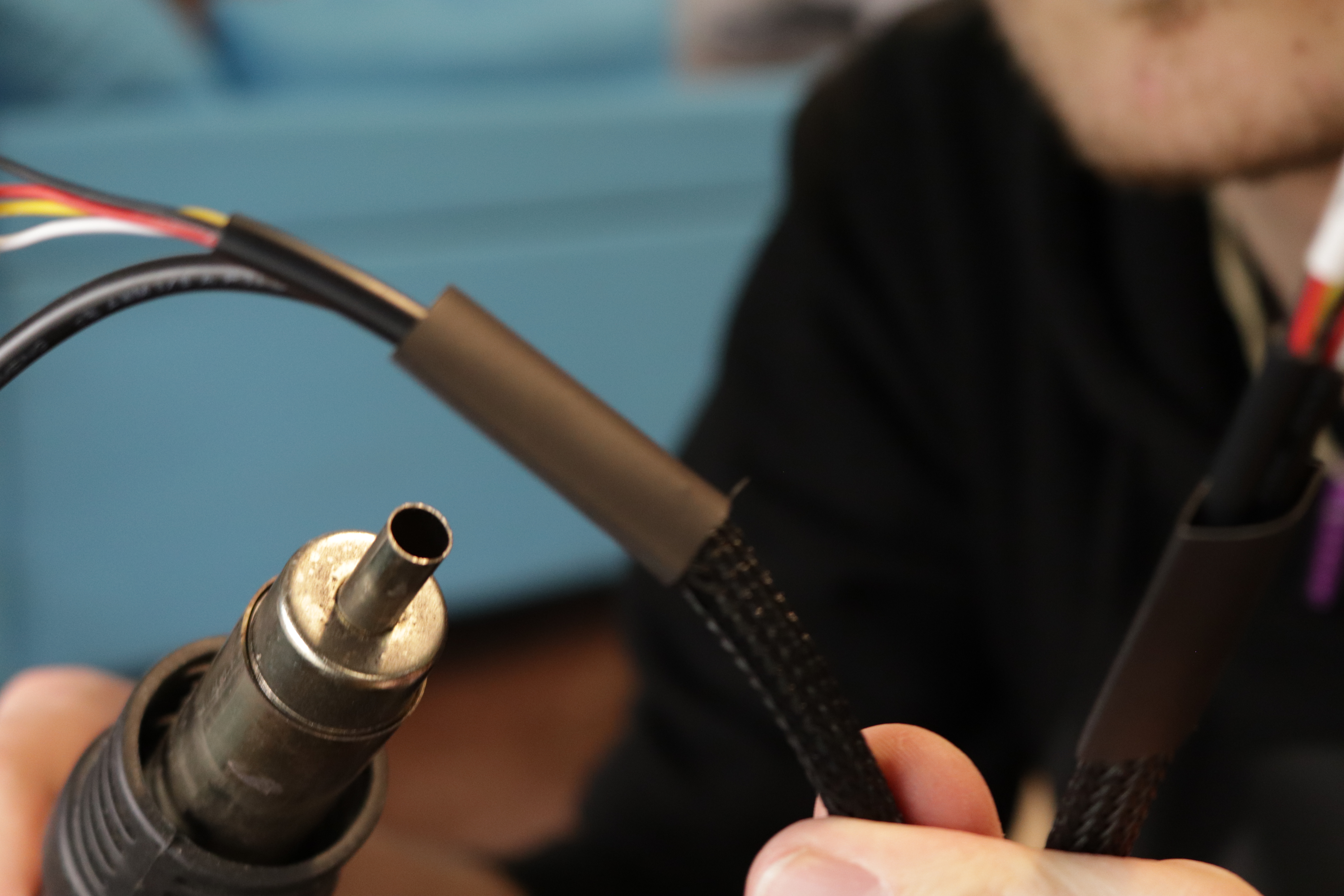 With the sheathing an equal distance from the closest connector on each side, slide two pieces of heatshrink tubing over the fraying end of the sheathing, with equal parts on the cables and on the sheathing. This is to hold the sheathing in place, keep it from fraying, and generally making it look nicer. Use a heat gun or lighter to heat the heatshrink tight onto the cable.