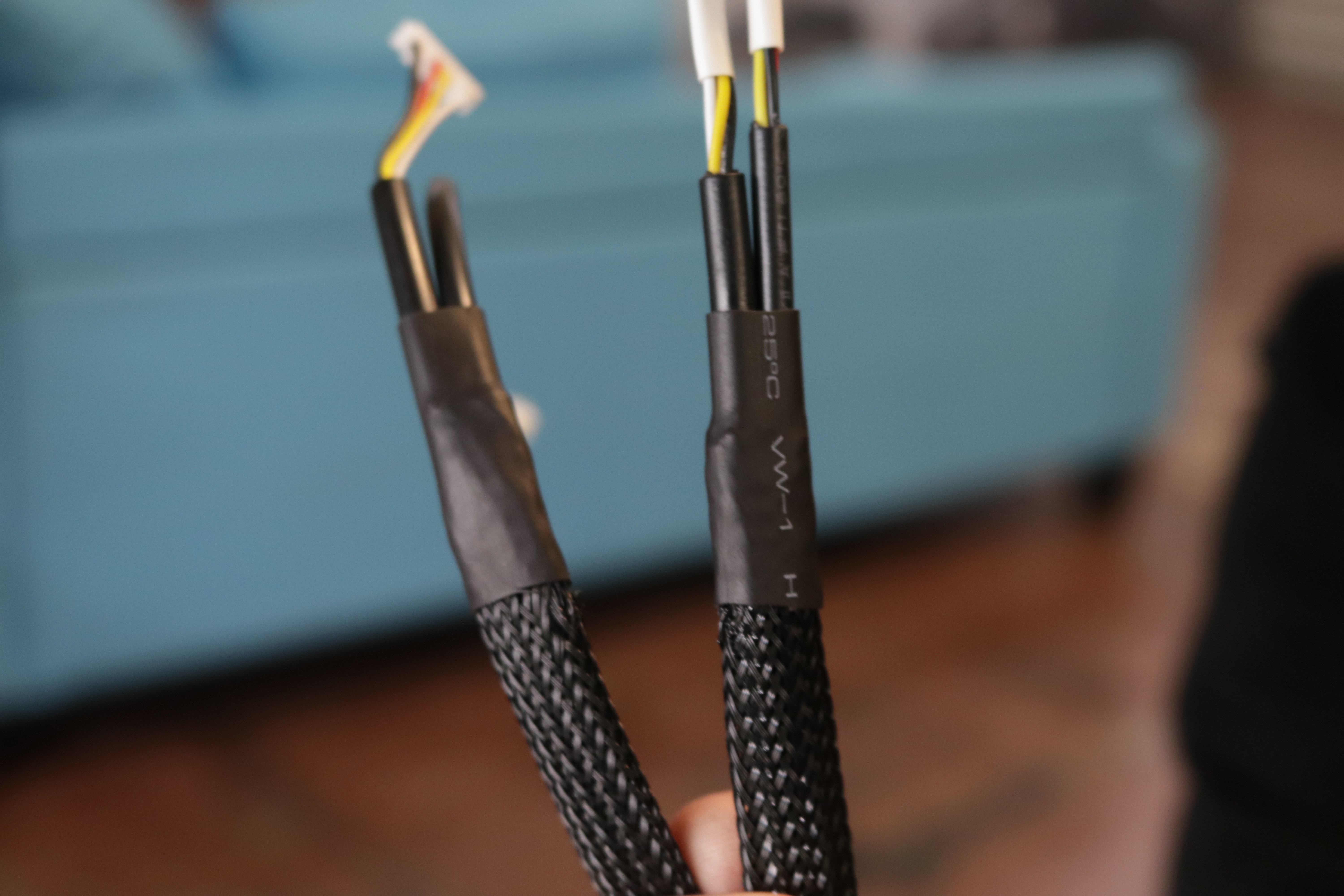 With the sheathing an equal distance from the closest connector on each side, slide two pieces of heatshrink tubing over the fraying end of the sheathing, with equal amounts on the cables and on the sheathing. This is to hold the sheathing in place, keep it from fraying, and generally making it look nicer. Use a heat gun or lighter to heat the heatshrink tight onto the cable.