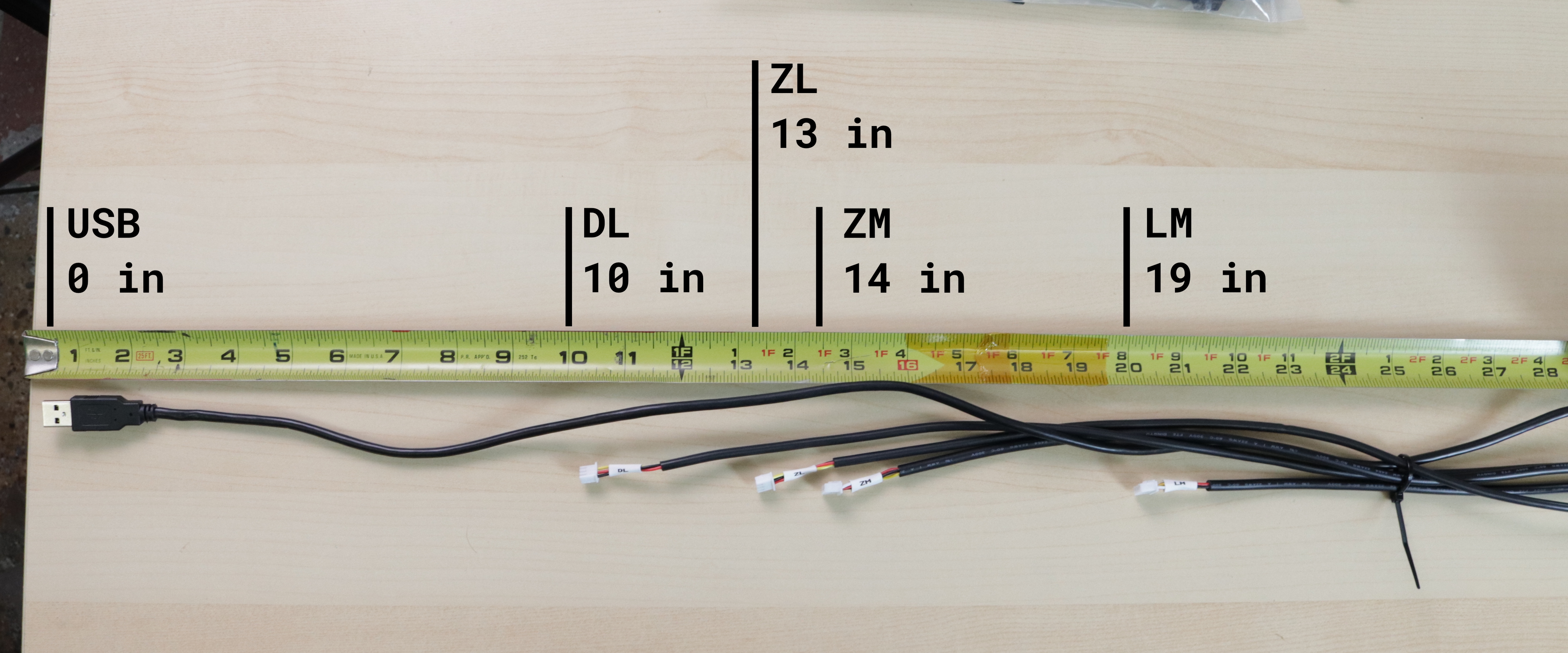 To begin, we'll get these five cables laid out at the correct spacing. Having these spaced correctly ensures that every cable reaches every plug with strain relief and length for movement. Use the image below to make the correct spacing.