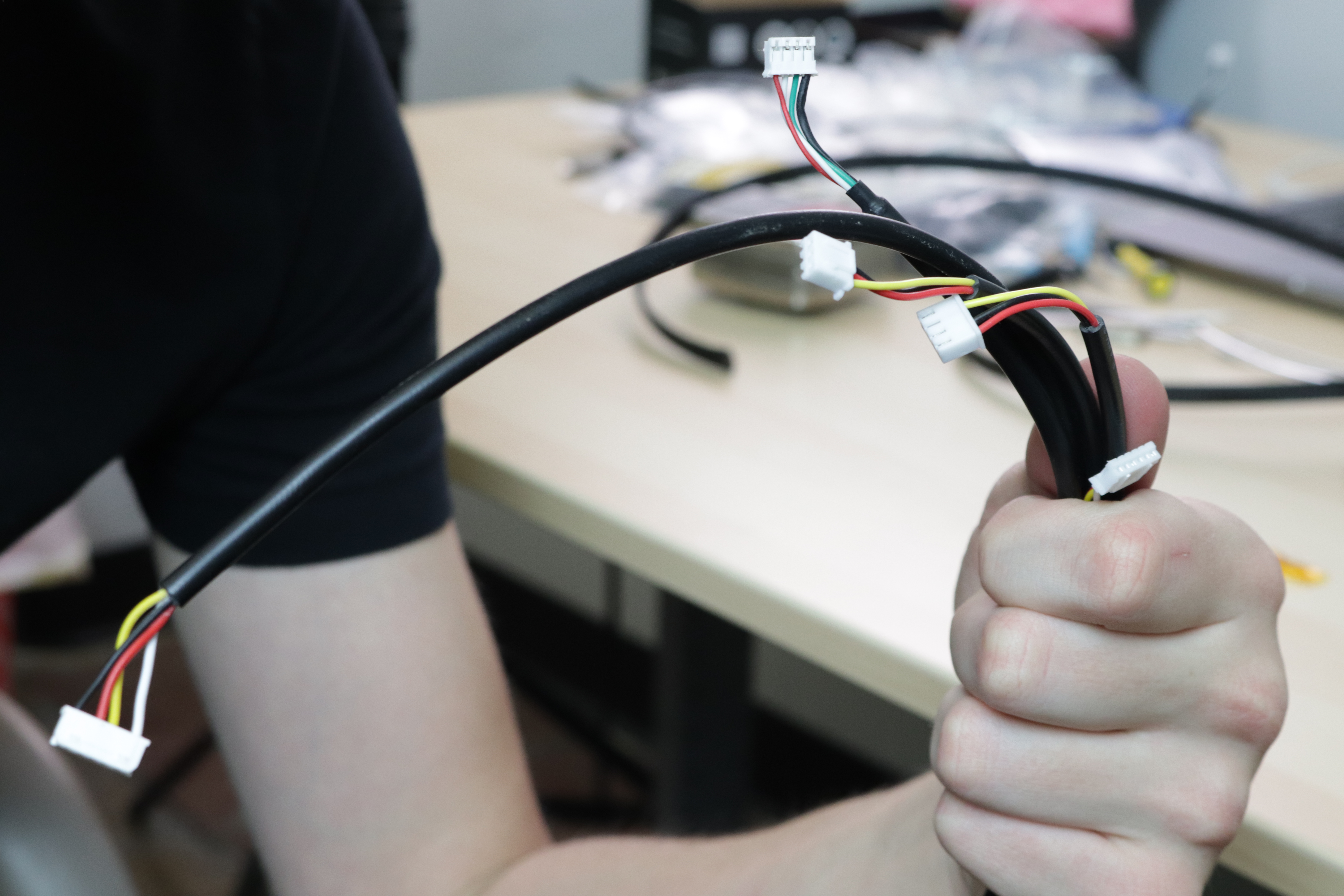 Push the sheathing up until there's equal amount of exposed black cable of the shorter cable, as shown below.