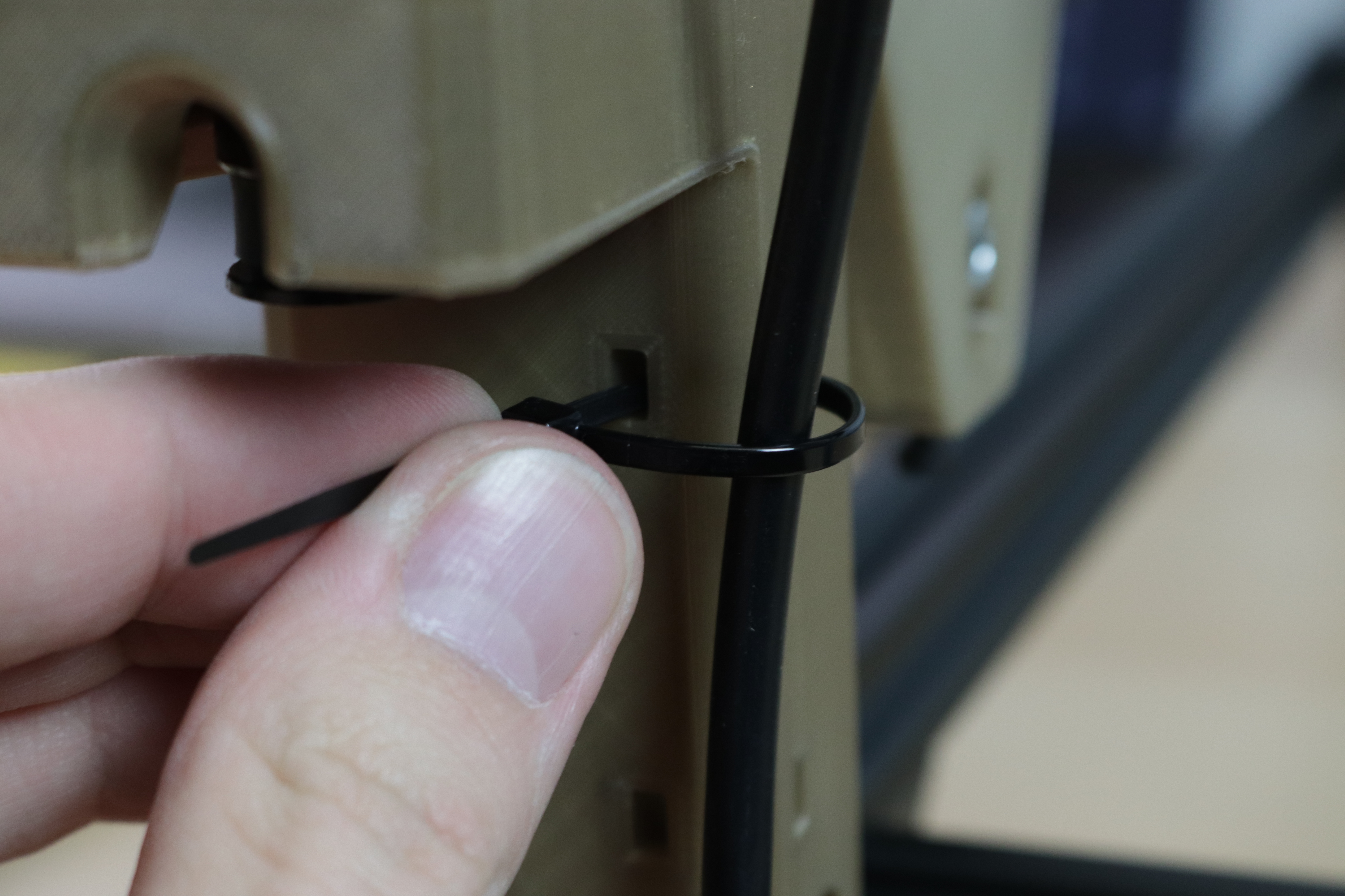 Use four zip ties to secure the wires in place using the channels in the back legs as shown below.