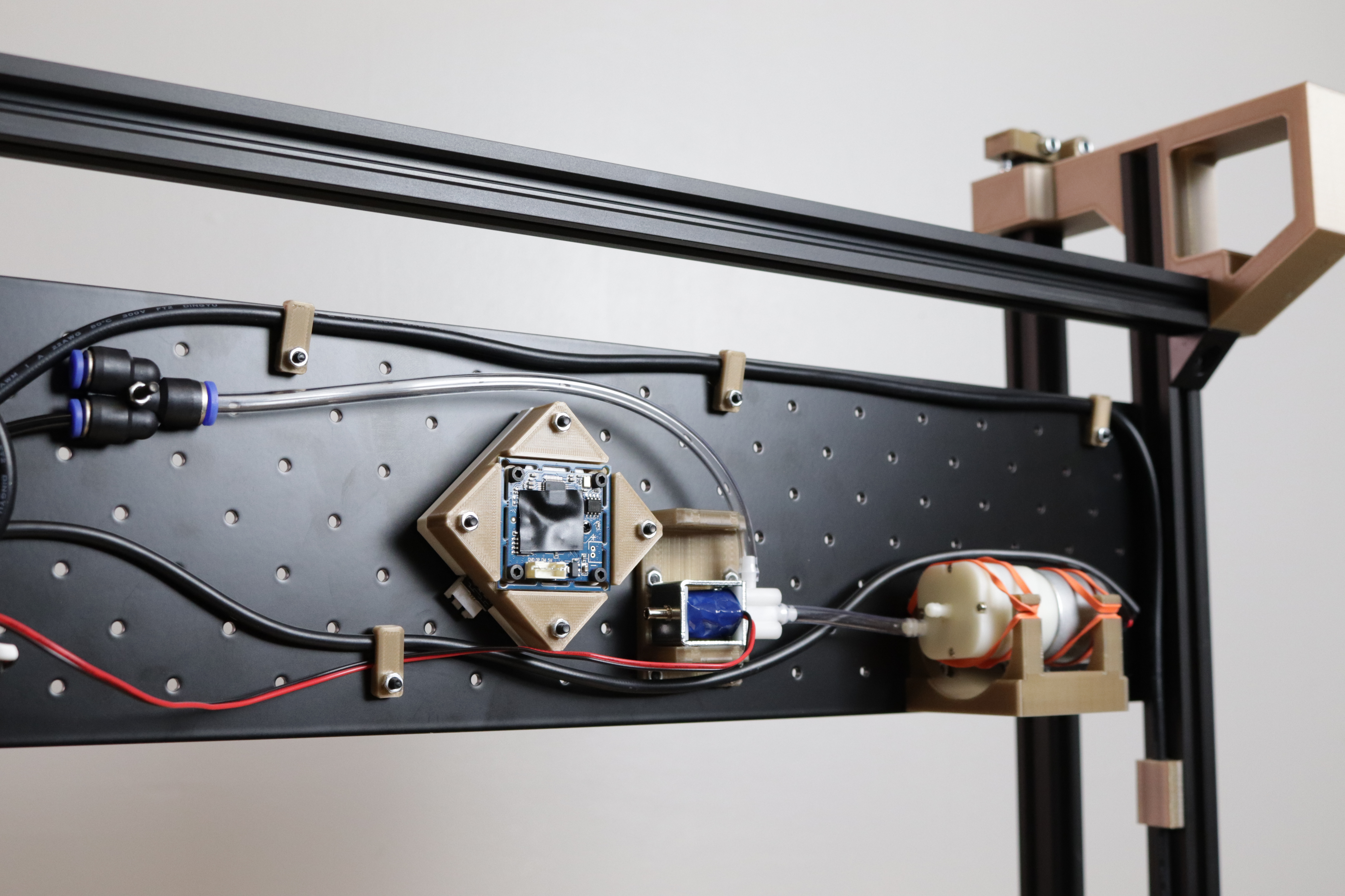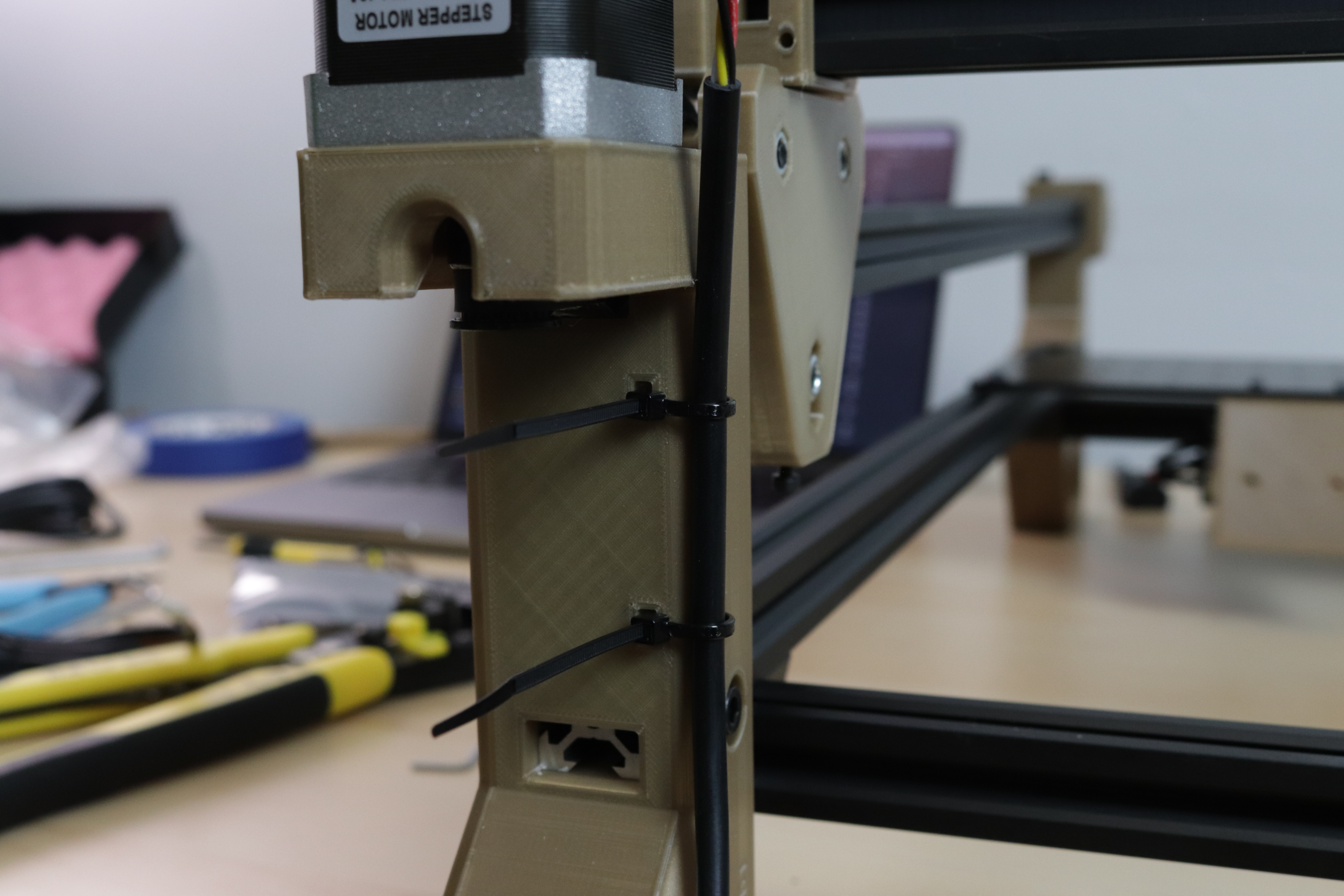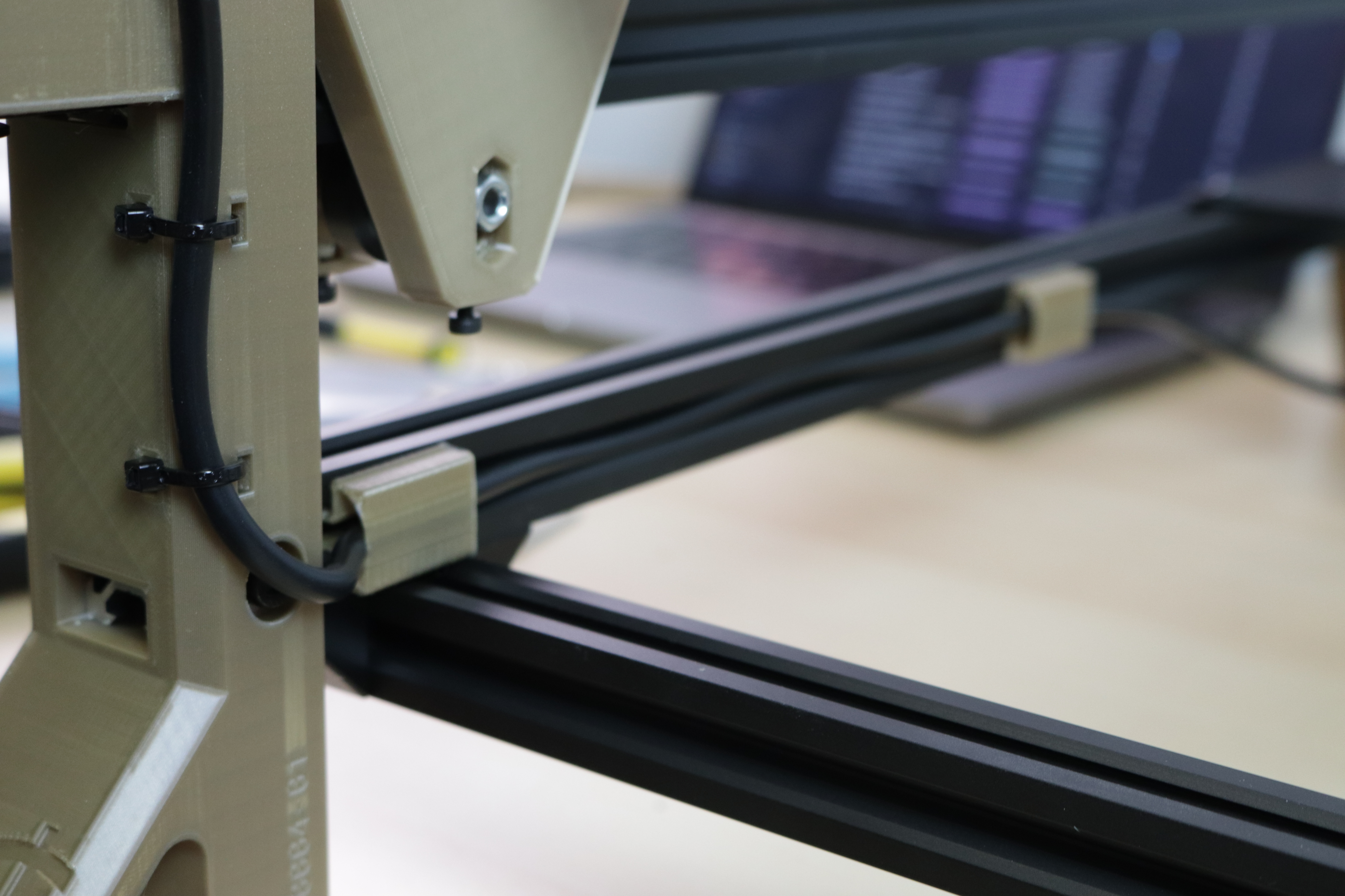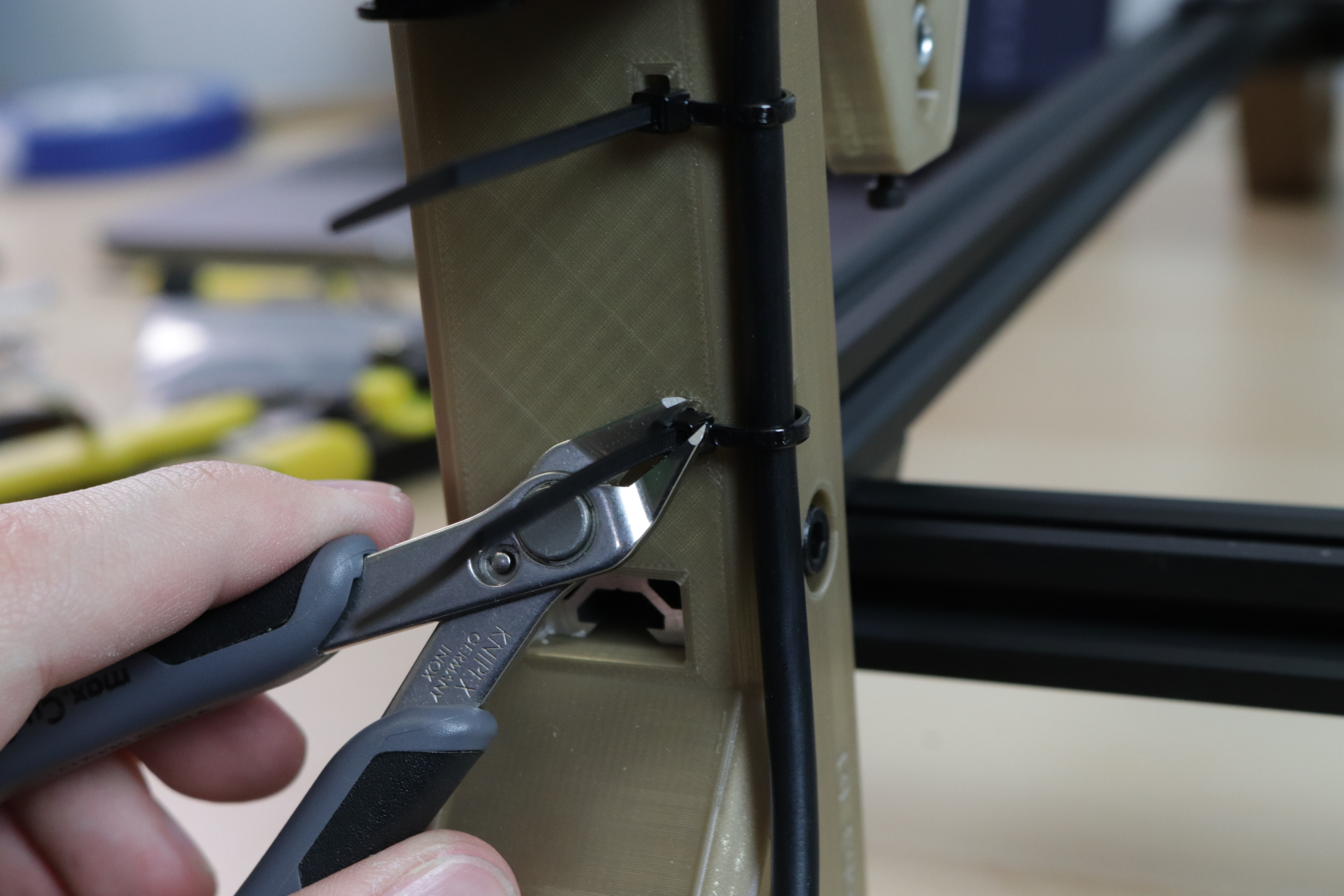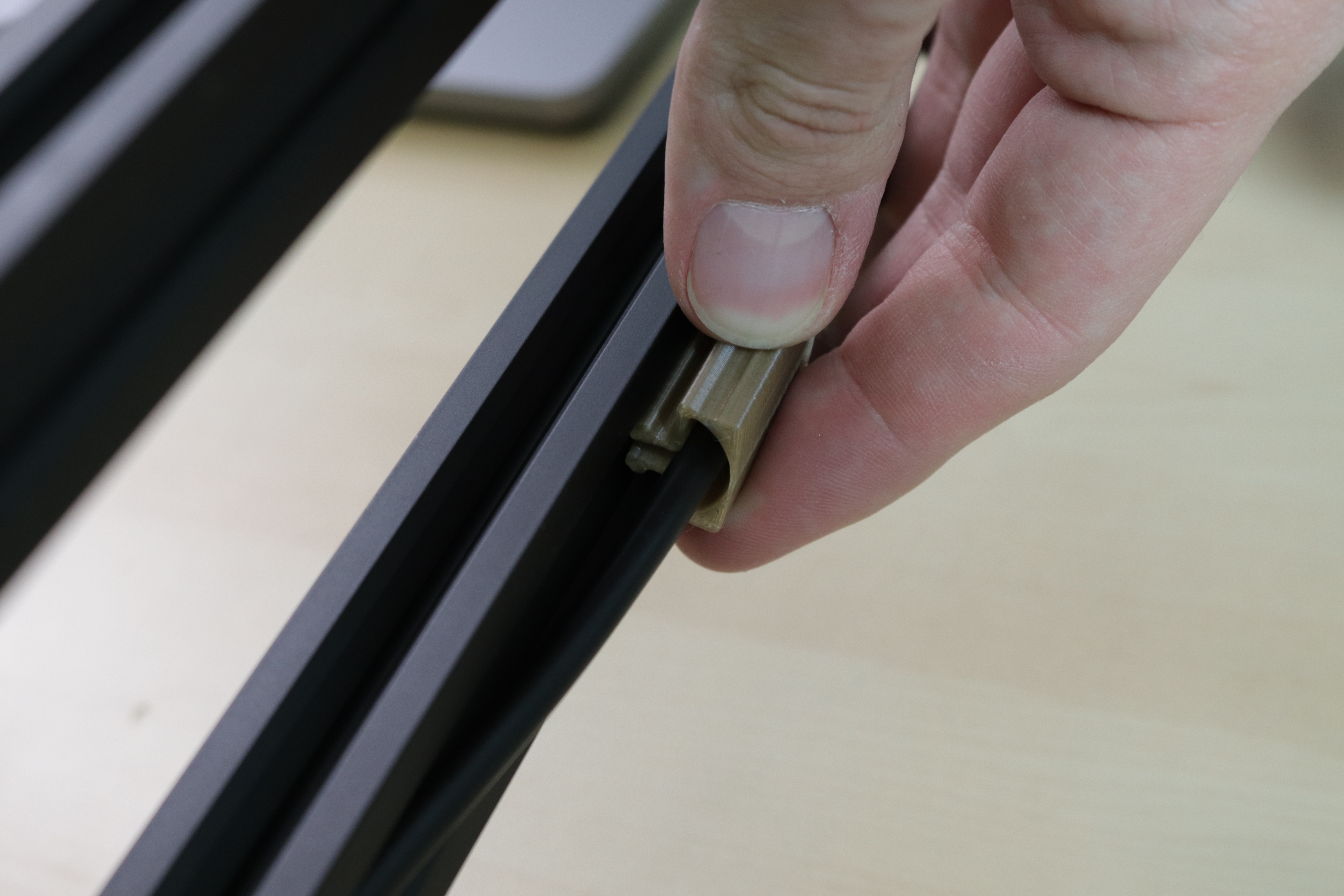 Next, put your LumenPnP up on its haunches, and route the cables along the inside groove of the extrusion extrusions running towards the front of the machine. Use