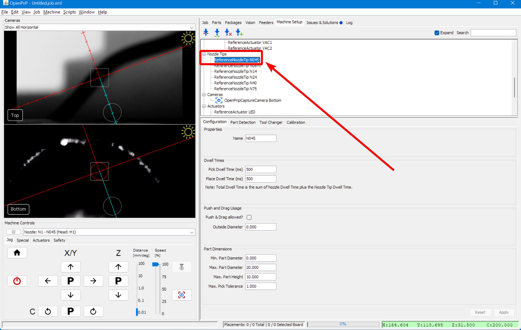 Throughout the course of a job, you will find that you need multiple different size nozzle tips to pick different sized components. By default OpenPnP will pause a job and wait for you to manually change a nozzle tip, but it can be more efficient to set up automatic tool changing. Perform the following optional steps for each of the nozzle tips you'll be switching between. We recommend reading the OpenPnP Wiki page about this as well.