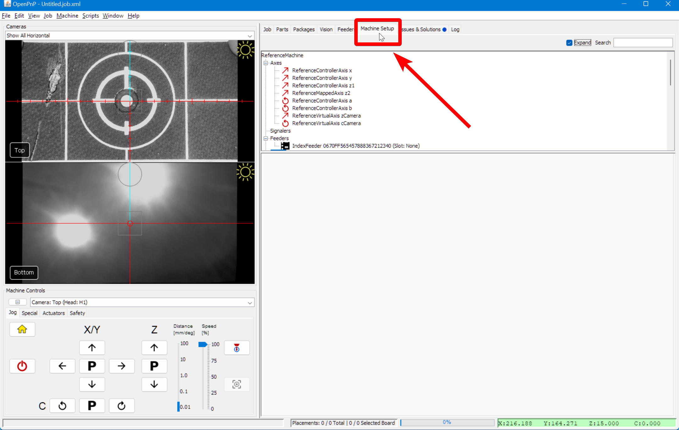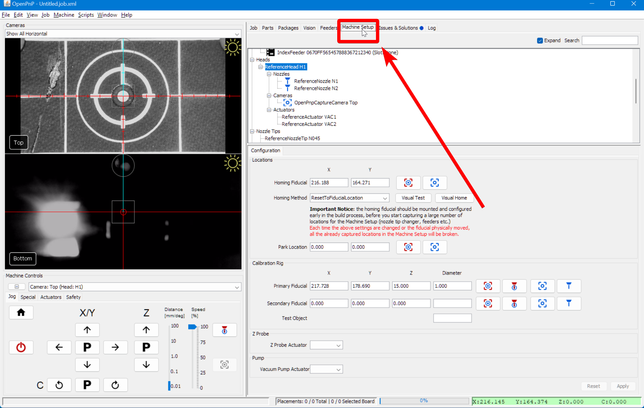 Machine Controls Pane > Jog Taband watch your machine home using the limit switches, then move the top camera over the homing fiducial and find its exact location. You may still get an error aboutnozzle tip calibration, which is normal. We'll be working on that next.