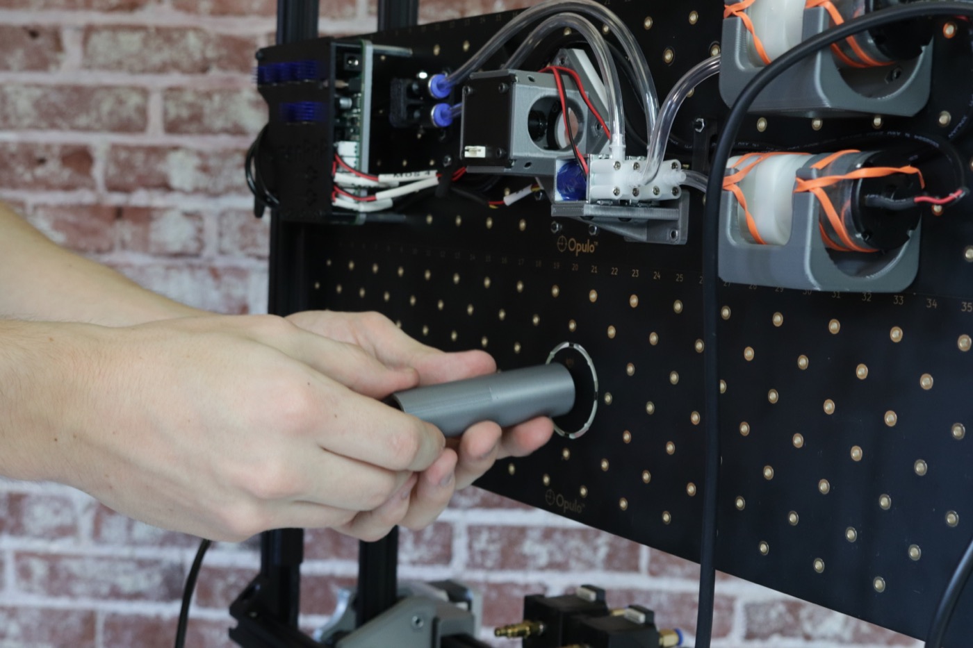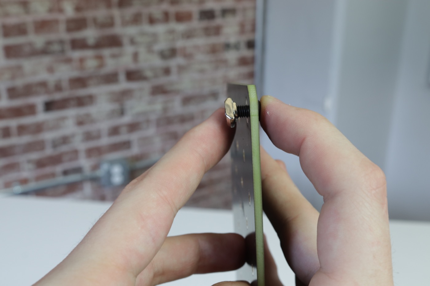Insert the button head screws through the large holes in the four corners of each plate. Make sure you are inserting them from the side of the plate that has the description text as shown, and not from the side with the Opulo logo. Loosely thread a t-slot nut onto the opposite side of each screw.