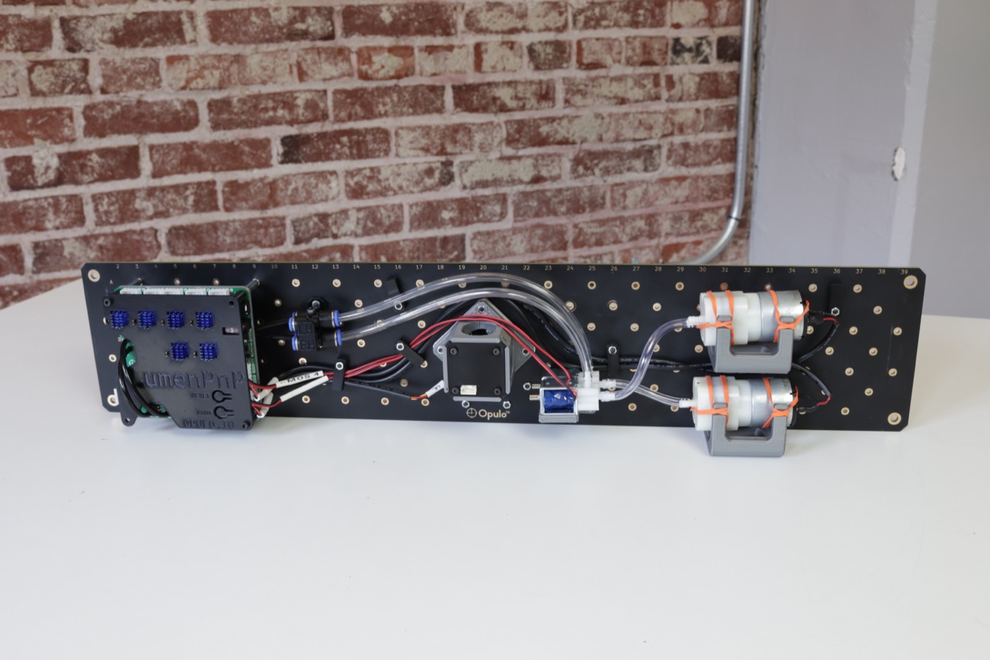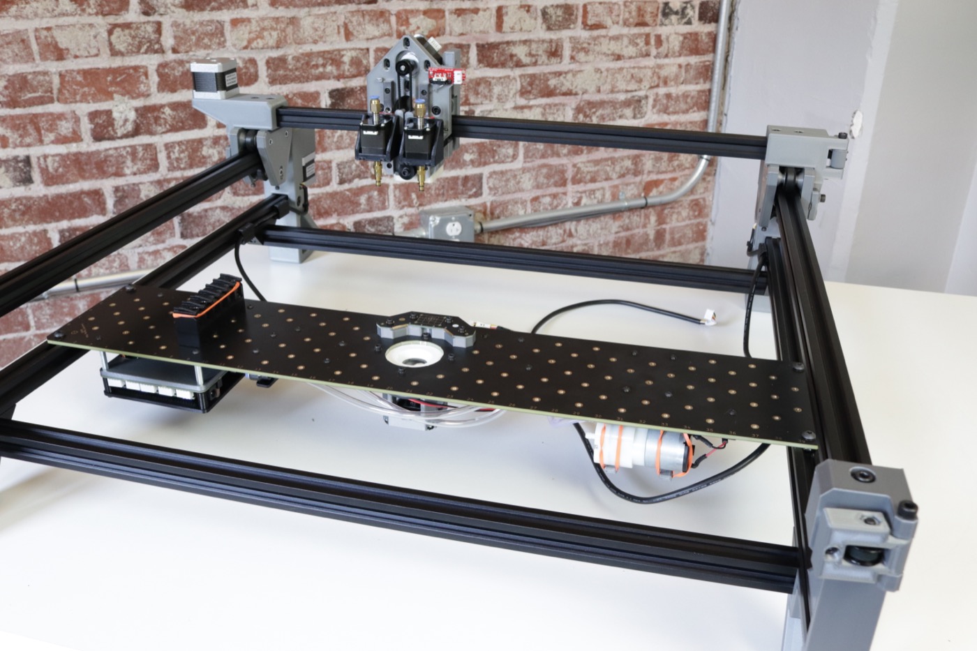 Remove the staging plate and build plate from the first tray. The staging plate has the motherboard, camera, pumps, valves, wiring, and tubing mounted on it. The build plate is bare.