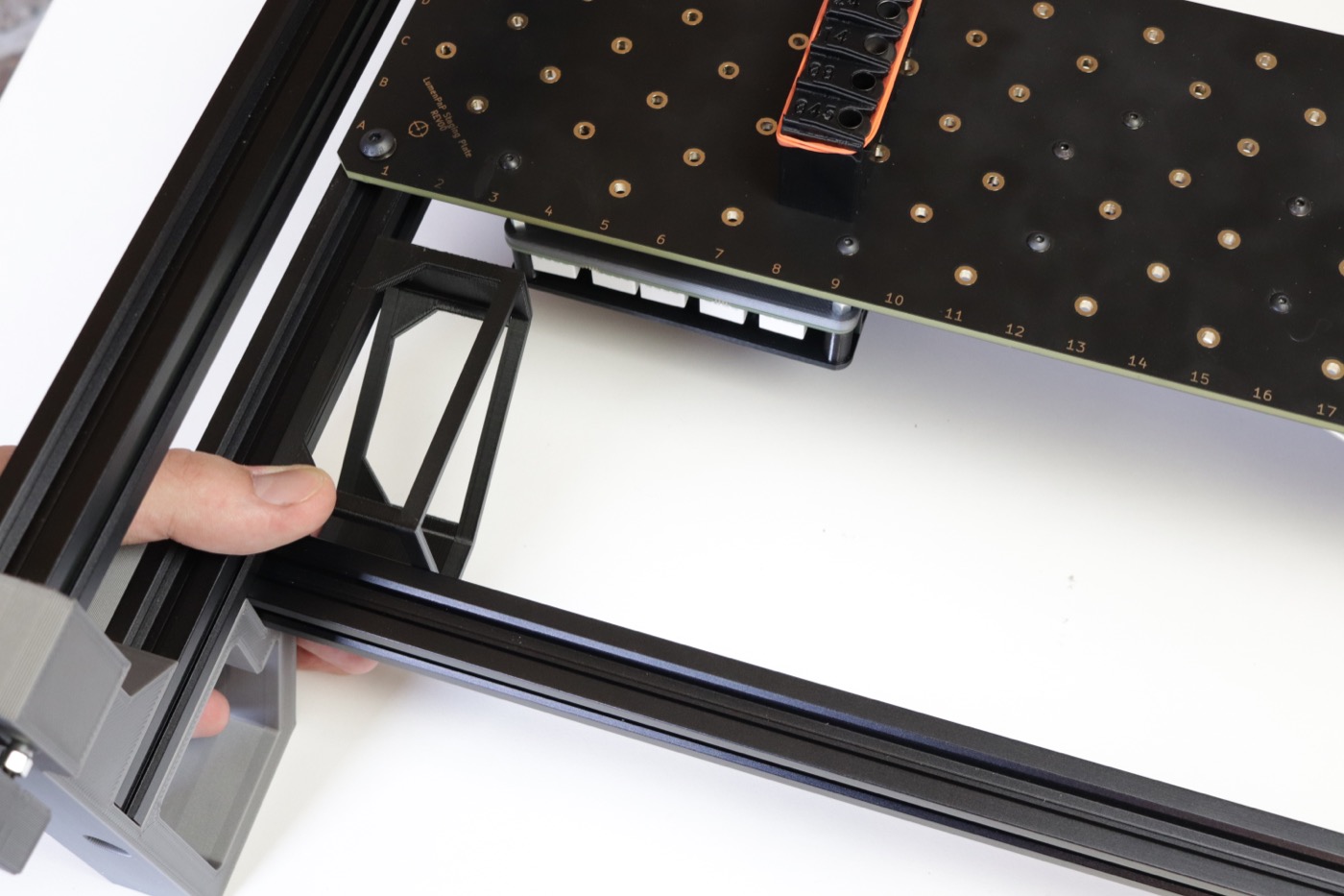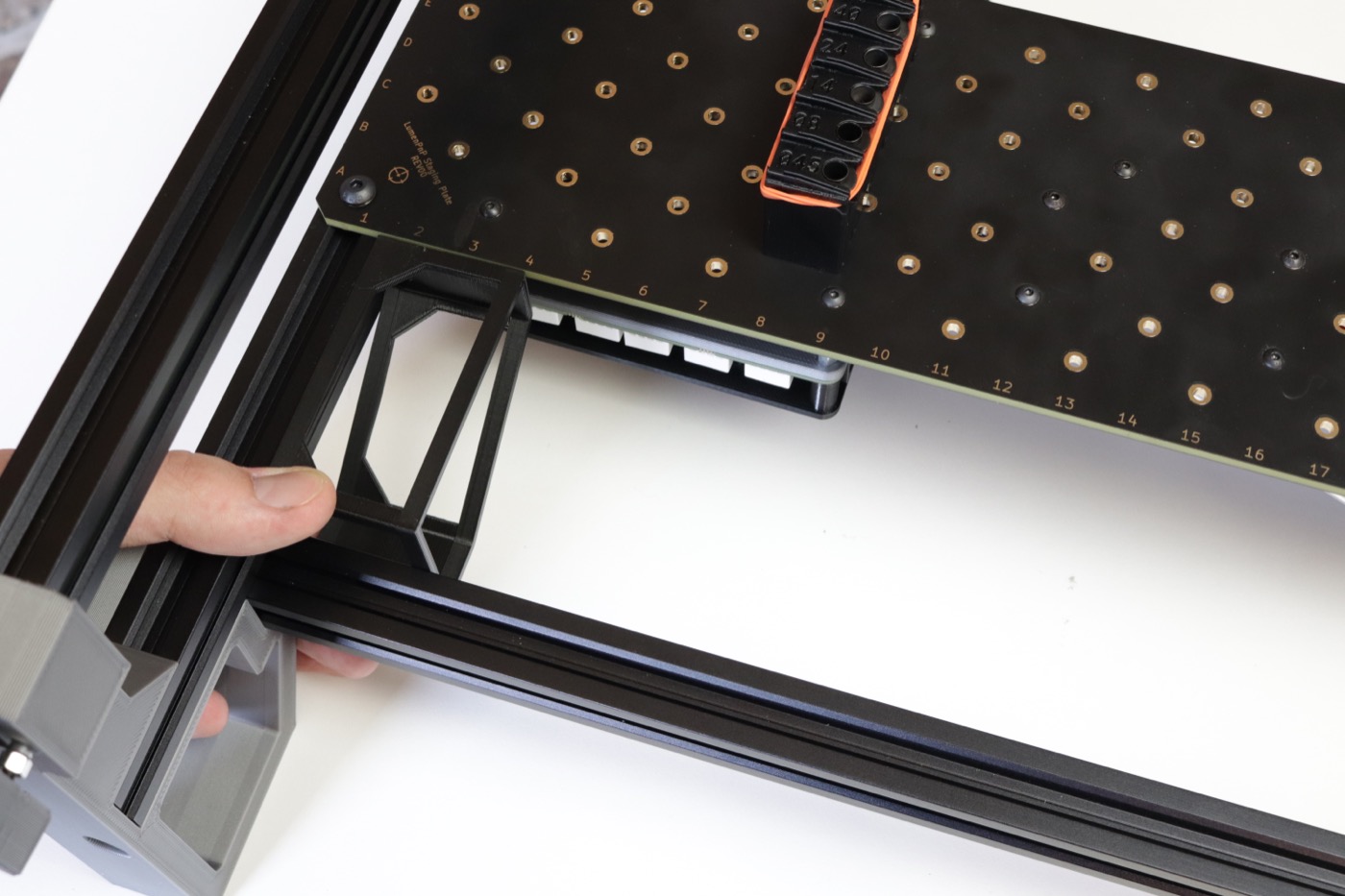 Place the staging plate into the machine as shown below. Have it rest on the lower of the two extrusions in each leg assembly. Make sure the staging plate's orientation matches the images below.
